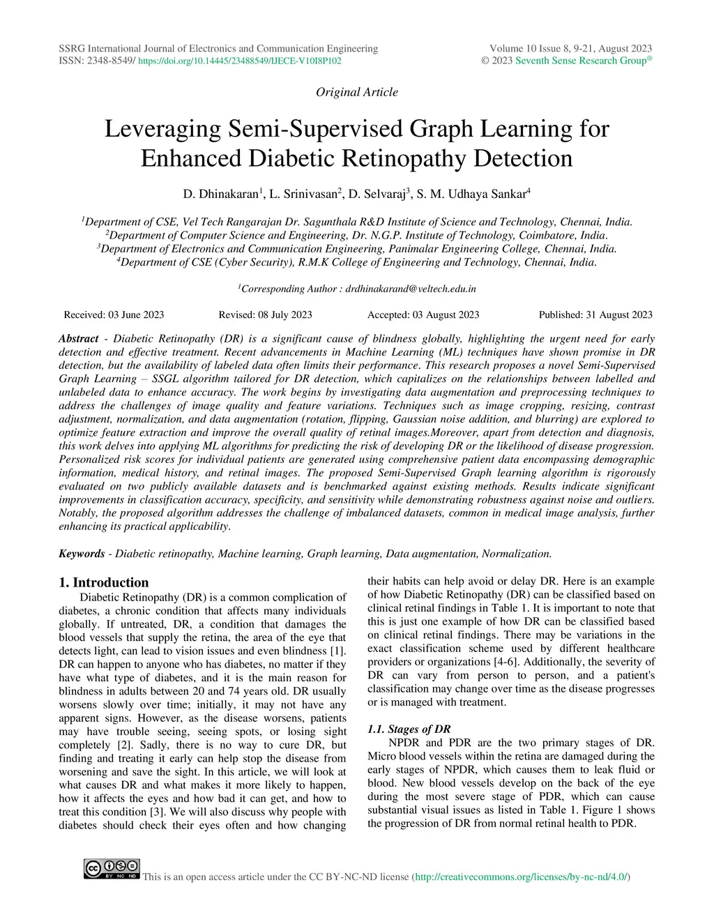 Diabetic Retinopathy (DR) is a significant cause of blindness globally, highlighting the urgent need for early detection and effective treatment. Recent advancements in Machine Learning (ML) techniques have shown promise in DR detection, but the availability of labeled data often limits their performance. This research proposes a novel Semi-Supervised Graph Learning SSGL algorithm tailored for DR detection, which capitalizes on the relationships between labelled and unlabeled data to enhance accuracy. The work begins by investigating data augmentation and preprocessing techniques to address the challenges of image quality and feature variations. Techniques such as image cropping, resizing, contrast adjustment, normalization, and data augmentation are explored to optimize feature extraction and improve the overall quality of retinal images. Moreover, apart from detection and diagnosis, this work delves into applying ML algorithms for predicting the risk of developing DR or the likelihood of disease progression. Personalized risk scores for individual patients are generated using comprehensive patient data encompassing demographic information, medical history, and retinal images. The proposed Semi-Supervised Graph learning algorithm is rigorously evaluated on two publicly available datasets and is benchmarked against existing methods. Results indicate significant improvements in classification accuracy, specificity, and sensitivity while demonstrating robustness against noise and outlie rs.Notably, the proposed algorithm addresses the challenge of imbalanced datasets, common in medical image analysis, further enhancing its practical applicability.