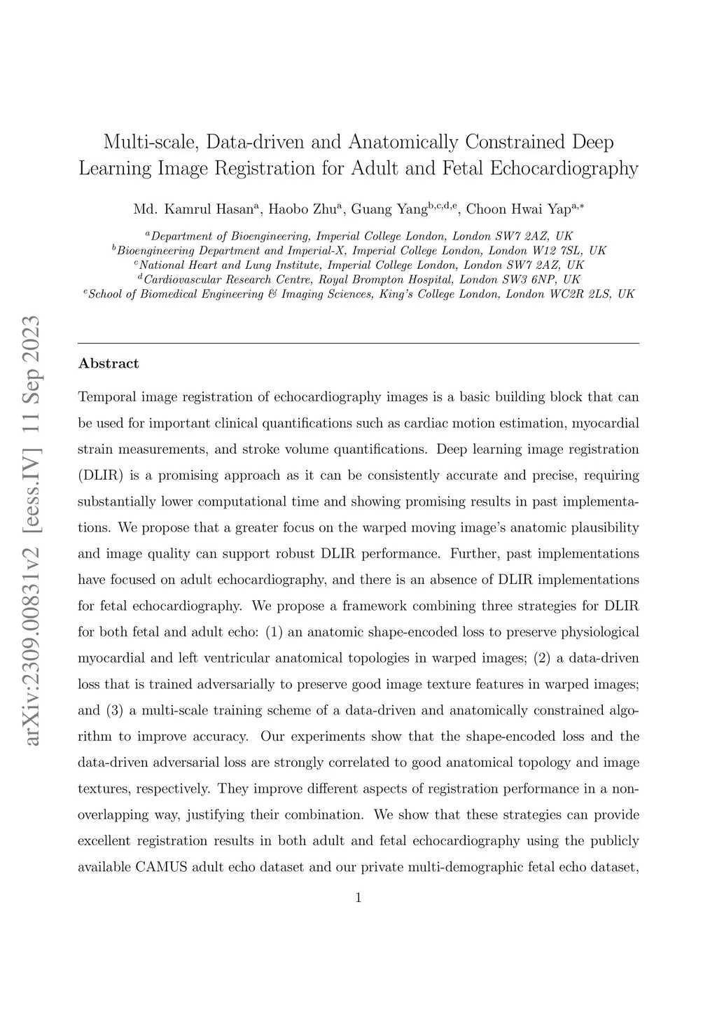 Temporal echocardiography image registration is a basis for clinical quantifications such as cardiac motion estimation, myocardial strain assessments, and stroke volume quantifications. In past studies, deep learning image registration (DLIR) has shown promising results and is consistently accurate and precise, requiring less computational time. We propose that a greater focus on the warped moving image's anatomic plausibility and image quality can support robust DLIR performance. Further, past implementations have focused on adult echocardiography, and there is an absence of DLIR implementations for fetal echocardiography. We propose a framework that combines three strategies for DLIR in both fetal and adult echo: (1) an anatomic shape-encoded loss to preserve physiological myocardial and left ventricular anatomical topologies in warped images; (2) a data-driven loss that is trained adversarially to preserve good image texture features in warped images; and (3) a multi-scale training scheme of a data-driven and anatomically constrained algorithm to improve accuracy. Our tests show that good anatomical topology and image textures are strongly linked to shape-encoded and data-driven adversarial losses. They improve different aspects of registration performance in a non-overlapping way, justifying their combination. Despite fundamental distinctions between adult and fetal echo images, we show that these strategies can provide excellent registration results in both adult and fetal echocardiography using the publicly available CAMUS adult echo dataset and our private multi-demographic fetal echo dataset. Our approach outperforms traditional non-DL gold standard registration approaches, including Optical Flow and Elastix. Registration improvements could be translated to more accurate and precise clinical quantification of cardiac ejection fraction, demonstrating a potential for translation.
