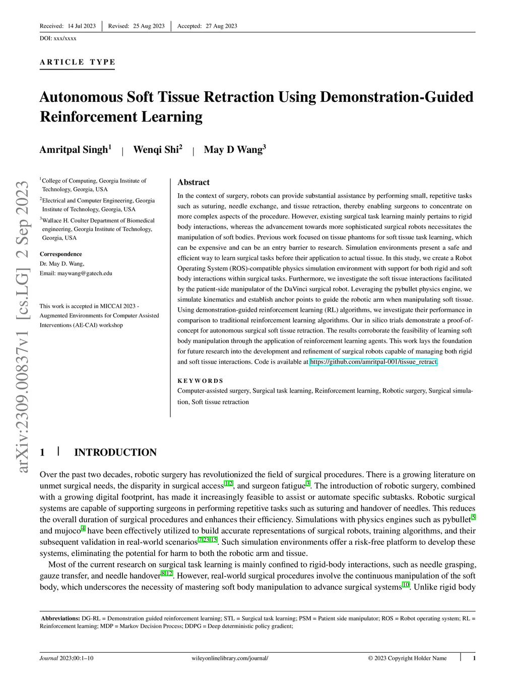 In the context of surgery, robots can provide substantial assistance by performing small, repetitive tasks such as suturing, needle exchange, and tissue retraction, thereby enabling surgeons to concentrate on more complex aspects of the procedure. However, existing surgical task learning mainly pertains to rigid body interactions, whereas the advancement towards more sophisticated surgical robots necessitates the manipulation of soft bodies. Previous work focused on tissue phantoms for soft tissue task learning, which can be expensive and can be an entry barrier to research. Simulation environments present a safe and efficient way to learn surgical tasks before their application to actual tissue. In this study, we create a Robot Operating System (ROS)-compatible physics simulation environment with support for both rigid and soft body interactions within surgical tasks. Furthermore, we investigate the soft tissue interactions facilitated by the patient-side manipulator of the DaVinci surgical robot. Leveraging the pybullet physics engine, we simulate kinematics and establish anchor points to guide the robotic arm when manipulating soft tissue. Using demonstration-guided reinforcement learning (RL) algorithms, we investigate their performance in comparison to traditional reinforcement learning algorithms. Our in silico trials demonstrate a proof-of-concept for autonomous surgical soft tissue retraction. The results corroborate the feasibility of learning soft body manipulation through the application of reinforcement learning agents. This work lays the foundation for future research into the development and refinement of surgical robots capable of managing both rigid and soft tissue interactions. Code is available at https://github.com/amritpal-001/tissue_retract.