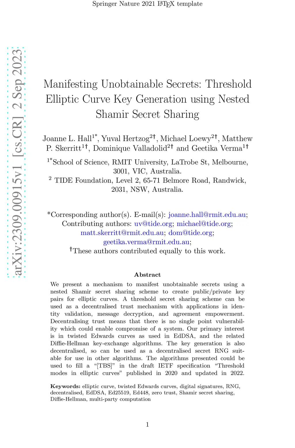 We present a mechanism to manifest unobtainable secrets using a nested Shamir secret sharing scheme to create public/private key pairs for elliptic curves. A threshold secret sharing scheme can be used as a decentralised trust mechanism with applications in identity validation, message decryption, and agreement empowerment. Decentralising trust means that there is no single point vulnerability which could enable compromise of a system. Our primary interest is in twisted Edwards curves as used in EdDSA, and the related Diffie-Hellman key-exchange algorithms. The key generation is also decentralised, so can be used as a decentralised secret RNG suitable for use in other algorithms. The algorithms presented could be used to fill a ``[TBS]'' in the draft IETF specification ``Threshold modes in elliptic curves'' published in 2020 and updated in 2022.