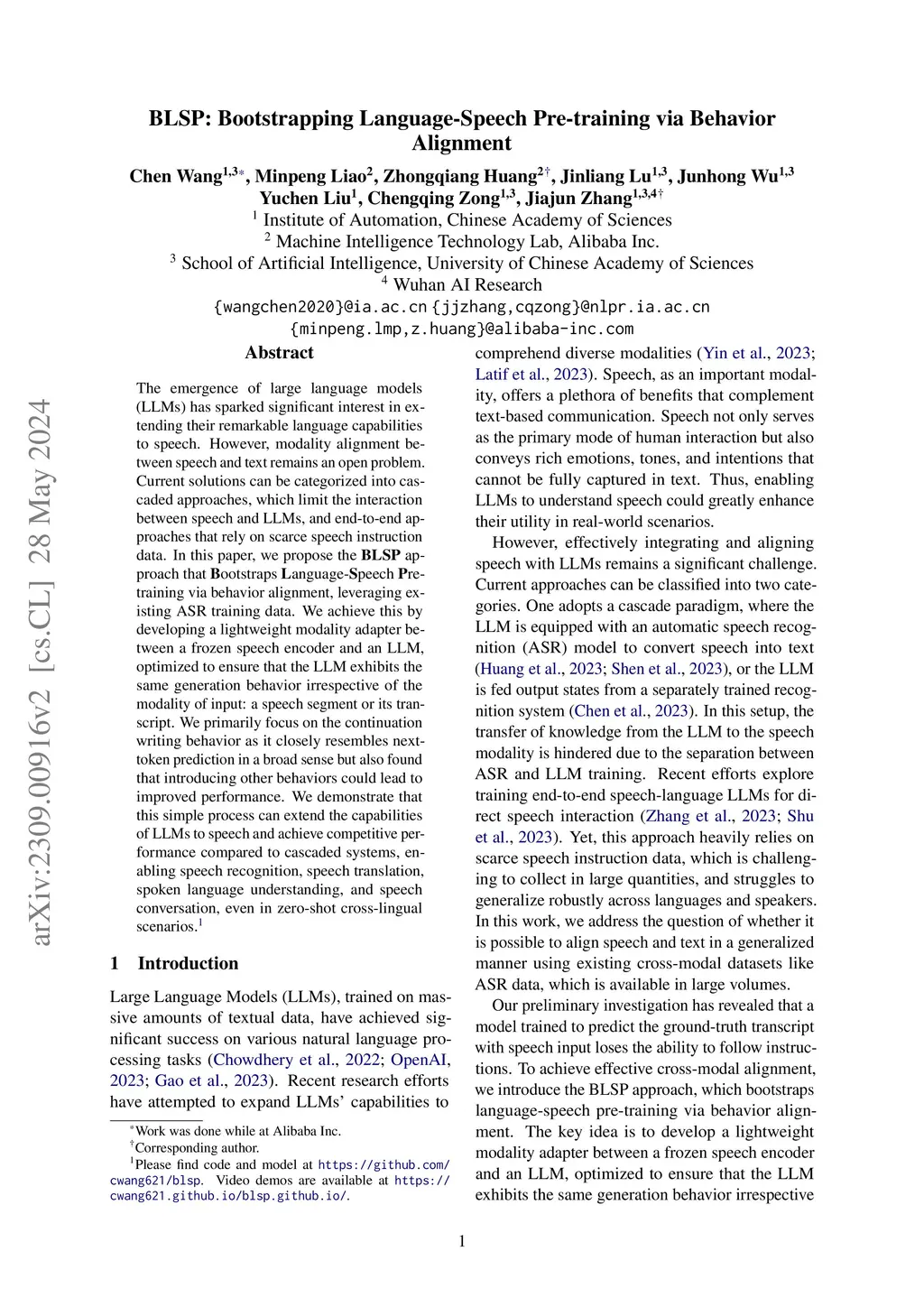 BLSP: Bootstrapping Language-Speech Pre-training via Behavior Alignment