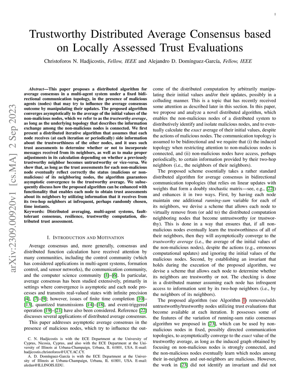 This paper proposes a distributed algorithm for average consensus in a multi-agent system under a fixed bidirectional communication topology, in the presence of malicious agents (nodes) that may try to influence the average consensus outcome by manipulating their updates. The proposed algorithm converges asymptotically to the average of the initial values of the non-malicious nodes, which we refer to as the trustworthy average, as long as the underlying topology that describes the information exchange among the non-malicious nodes is connected. We first present a distributed iterative algorithm that assumes that each node receives (at each iteration or periodically) side information about the trustworthiness of the other nodes, and it uses such trust assessments to determine whether or not to incorporate messages received from its neighbors, as well as to make proper adjustments in its calculation depending on whether a previously trustworthy neighbor becomes untrustworthy or vice-versa. We show that, as long as the trust assessments for each non-malicious node eventually reflect correctly the status (malicious or non-malicious) of its neighboring nodes, the algorithm guarantees asymptotic convergence to the trustworthy average. We subsequently discuss how the proposed algorithm can be enhanced with functionality that enables each node to obtain trust assessments about its neighbors by utilizing information that it receives from its two-hop neighbors at infrequent, perhaps randomly chosen, time instants.
