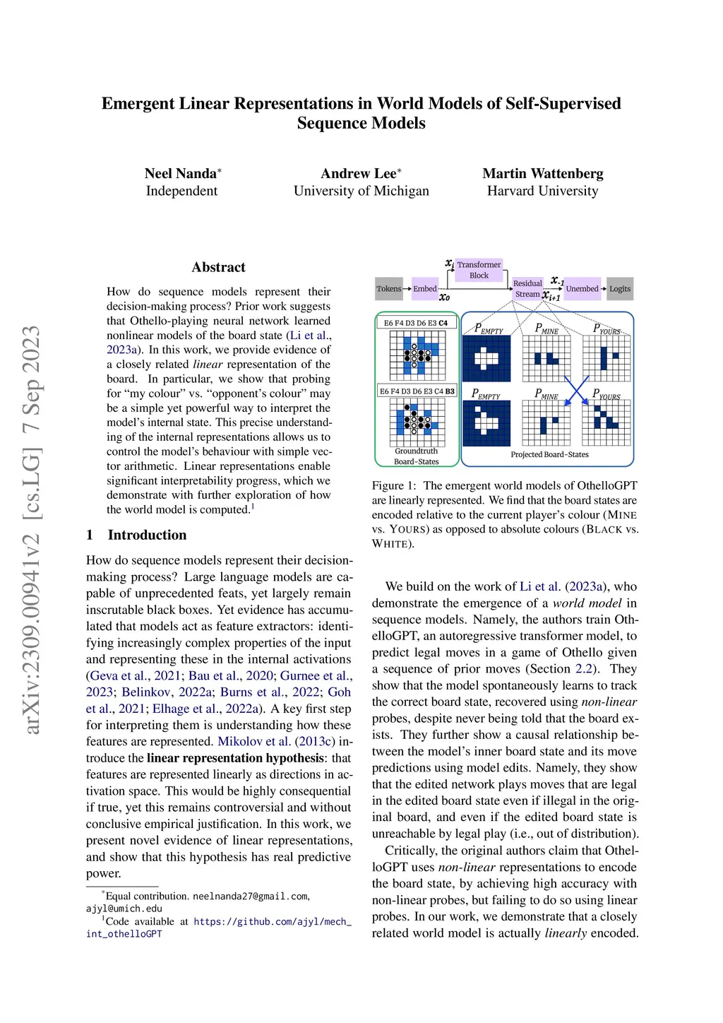 How do sequence models represent their decision-making process? Prior work suggests that Othello-playing neural network learned nonlinear models of the board state (Li et al., 2023). In this work, we provide evidence of a closely related linear representation of the board. In particular, we show that probing for "my colour" vs. "opponent's colour" may be a simple yet powerful way to interpret the model's internal state. This precise understanding of the internal representations allows us to control the model's behaviour with simple vector arithmetic. Linear representations enable significant interpretability progress, which we demonstrate with further exploration of how the world model is computed.