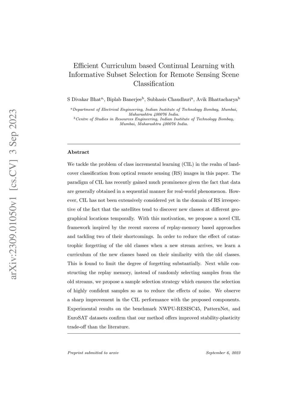 We tackle the problem of class incremental learning (CIL) in the realm of landcover classification from optical remote sensing (RS) images in this paper. The paradigm of CIL has recently gained much prominence given the fact that data are generally obtained in a sequential manner for real-world phenomenon. However, CIL has not been extensively considered yet in the domain of RS irrespective of the fact that the satellites tend to discover new classes at different geographical locations temporally. With this motivation, we propose a novel CIL framework inspired by the recent success of replay-memory based approaches and tackling two of their shortcomings. In order to reduce the effect of catastrophic forgetting of the old classes when a new stream arrives, we learn a curriculum of the new classes based on their similarity with the old classes. This is found to limit the degree of forgetting substantially. Next while constructing the replay memory, instead of randomly selecting samples from the old streams, we propose a sample selection strategy which ensures the selection of highly confident samples so as to reduce the effects of noise. We observe a sharp improvement in the CIL performance with the proposed components. Experimental results on the benchmark NWPU-RESISC45, PatternNet, and EuroSAT datasets confirm that our method offers improved stability-plasticity trade-off than the literature.
