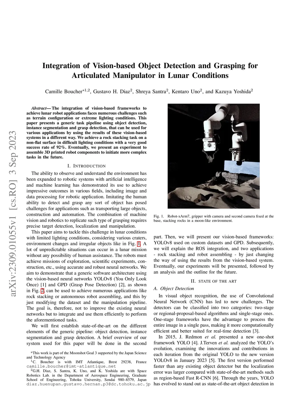 The integration of vision-based frameworks to achieve lunar robot applications faces numerous challenges such as terrain configuration or extreme lighting conditions. This paper presents a generic task pipeline using object detection, instance segmentation and grasp detection, that can be used for various applications by using the results of these vision-based systems in a different way. We achieve a rock stacking task on a non-flat surface in difficult lighting conditions with a very good success rate of 92%. Eventually, we present an experiment to assemble 3D printed robot components to initiate more complex tasks in the future.