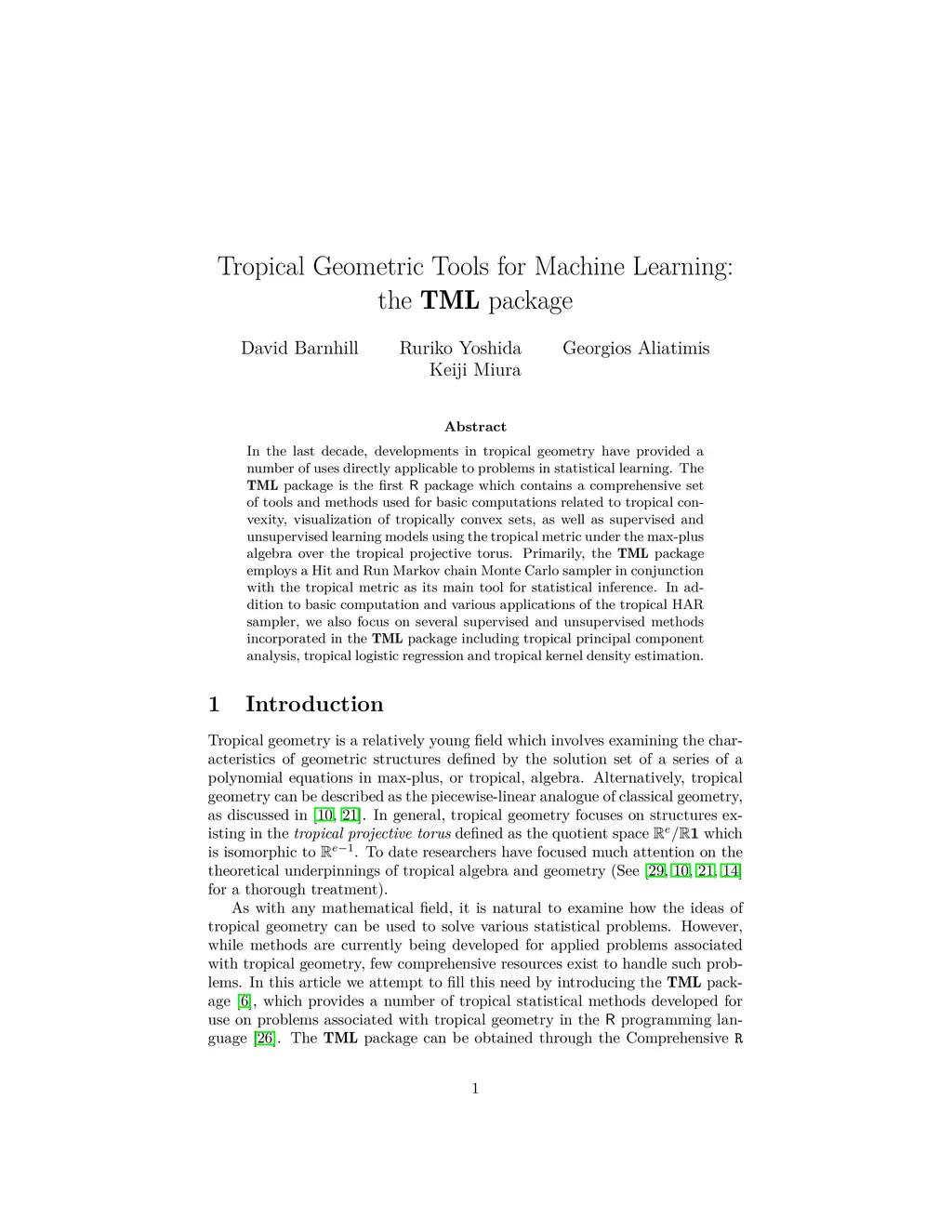 In the last decade, developments in tropical geometry have provided a number of uses directly applicable to problems in statistical learning. The TML package is the first R package which contains a comprehensive set of tools and methods used for basic computations related to tropical convexity, visualization of tropically convex sets, as well as supervised and unsupervised learning models using the tropical metric under the max-plus algebra over the tropical projective torus. Primarily, the TML package employs a Hit and Run Markov chain Monte Carlo sampler in conjunction with the tropical metric as its main tool for statistical inference. In addition to basic computation and various applications of the tropical HAR sampler, we also focus on several supervised and unsupervised methods incorporated in the TML package including tropical principal component analysis, tropical logistic regression and tropical kernel density estimation.