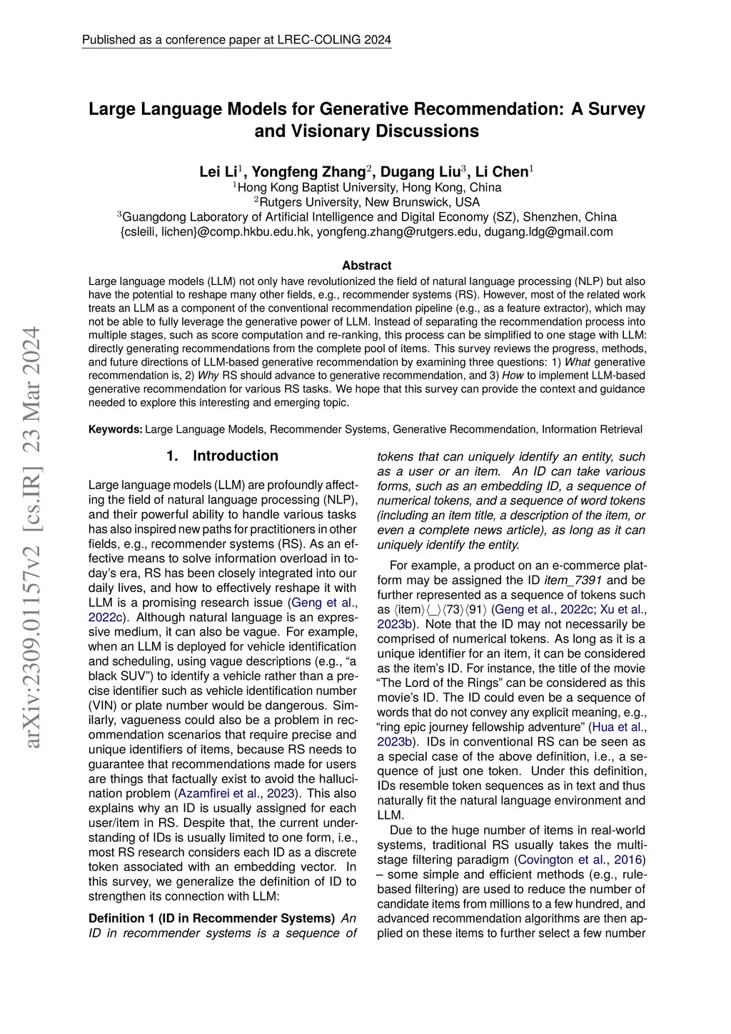Large language models (LLM) not only have revolutionized the field of natural language processing (NLP) but also have the potential to reshape many other fields, e.g., recommender systems (RS). However, most of the related work treats an LLM as a component of the conventional recommendation pipeline (e.g., as a feature extractor), which may not be able to fully leverage the generative power of LLM. Instead of separating the recommendation process into multiple stages, such as score computation and re-ranking, this process can be simplified to one stage with LLM: directly generating recommendations from the complete pool of items. This survey reviews the progress, methods, and future directions of LLM-based generative recommendation by examining three questions: 1) What generative recommendation is, 2) Why RS should advance to generative recommendation, and 3) How to implement LLM-based generative recommendation for various RS tasks. We hope that this survey can provide the context and guidance needed to explore this interesting and emerging topic.