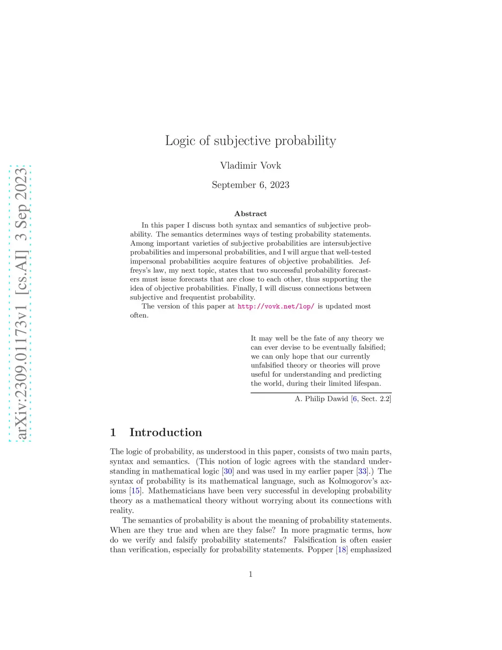 In this paper I discuss both syntax and semantics of subjective probability. The semantics determines ways of testing probability statements. Among important varieties of subjective probabilities are intersubjective probabilities and impersonal probabilities, and I will argue that well-tested impersonal probabilities acquire features of objective probabilities. Jeffreys's law, my next topic, states that two successful probability forecasters must issue forecasts that are close to each other, thus supporting the idea of objective probabilities. Finally, I will discuss connections between subjective and frequentist probability.