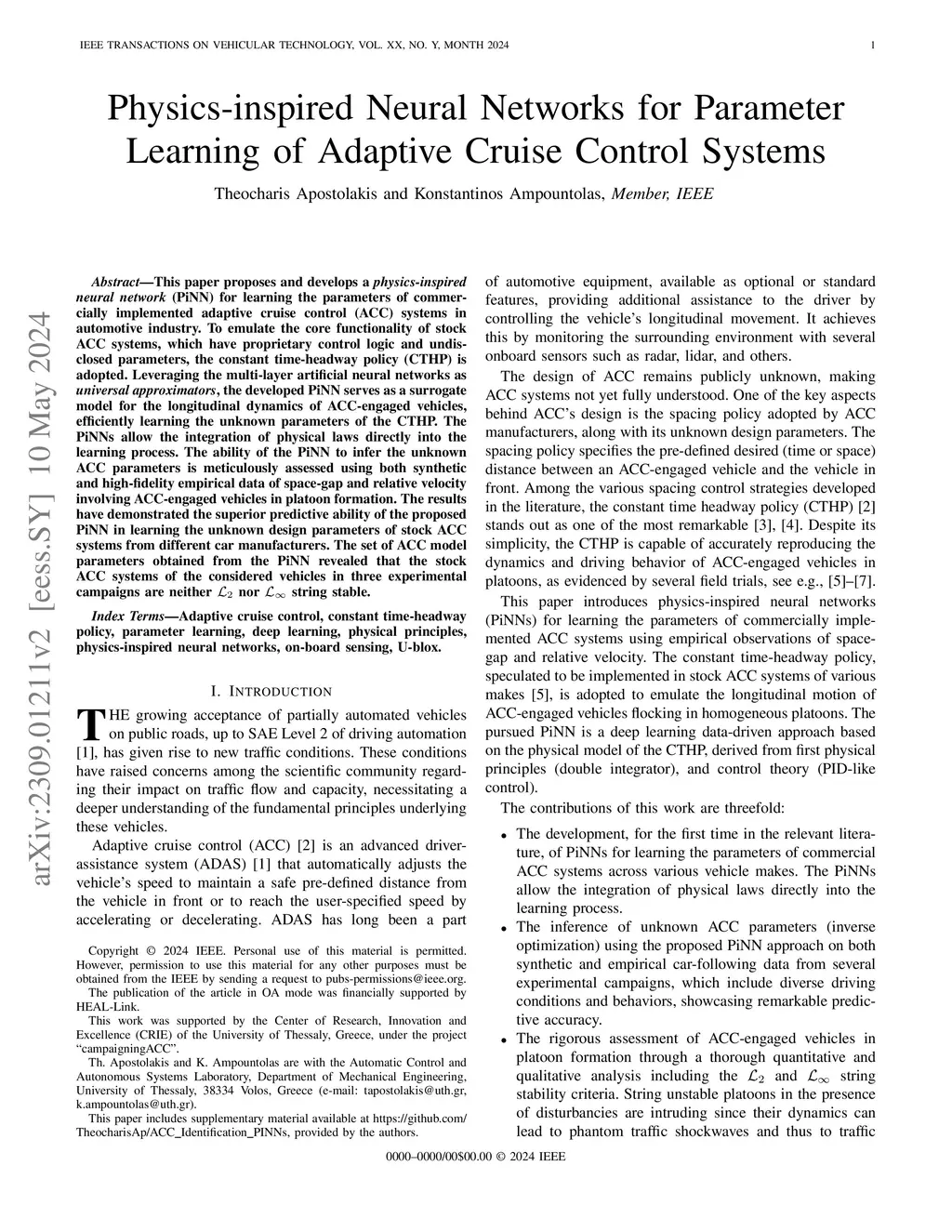 This paper proposes and develops a physics-inspired neural network (PiNN) for learning the parameters of commercially implemented adaptive cruise control (ACC) systems in automotive industry. To emulate the core functionality of stock ACC systems, which have proprietary control logic and undisclosed parameters, the constant time-headway policy (CTHP) is adopted. Leveraging the multi-layer artificial neural networks as universal approximators, the developed PiNN serves as a surrogate model for the longitudinal dynamics of ACC-engaged vehicles, efficiently learning the unknown parameters of the CTHP. The PiNNs allow the integration of physical laws directly into the learning process. The ability of the PiNN to infer the unknown ACC parameters is meticulously assessed using both synthetic and high-fidelity empirical data of space-gap and relative velocity involving ACC-engaged vehicles in platoon formation. The results have demonstrated the superior predictive ability of the proposed PiNN in learning the unknown design parameters of stock ACC systems from different car manufacturers. The set of ACC model parameters obtained from the PiNN revealed that the stock ACC systems of the considered vehicles in three experimental campaigns are neither nor string stable.