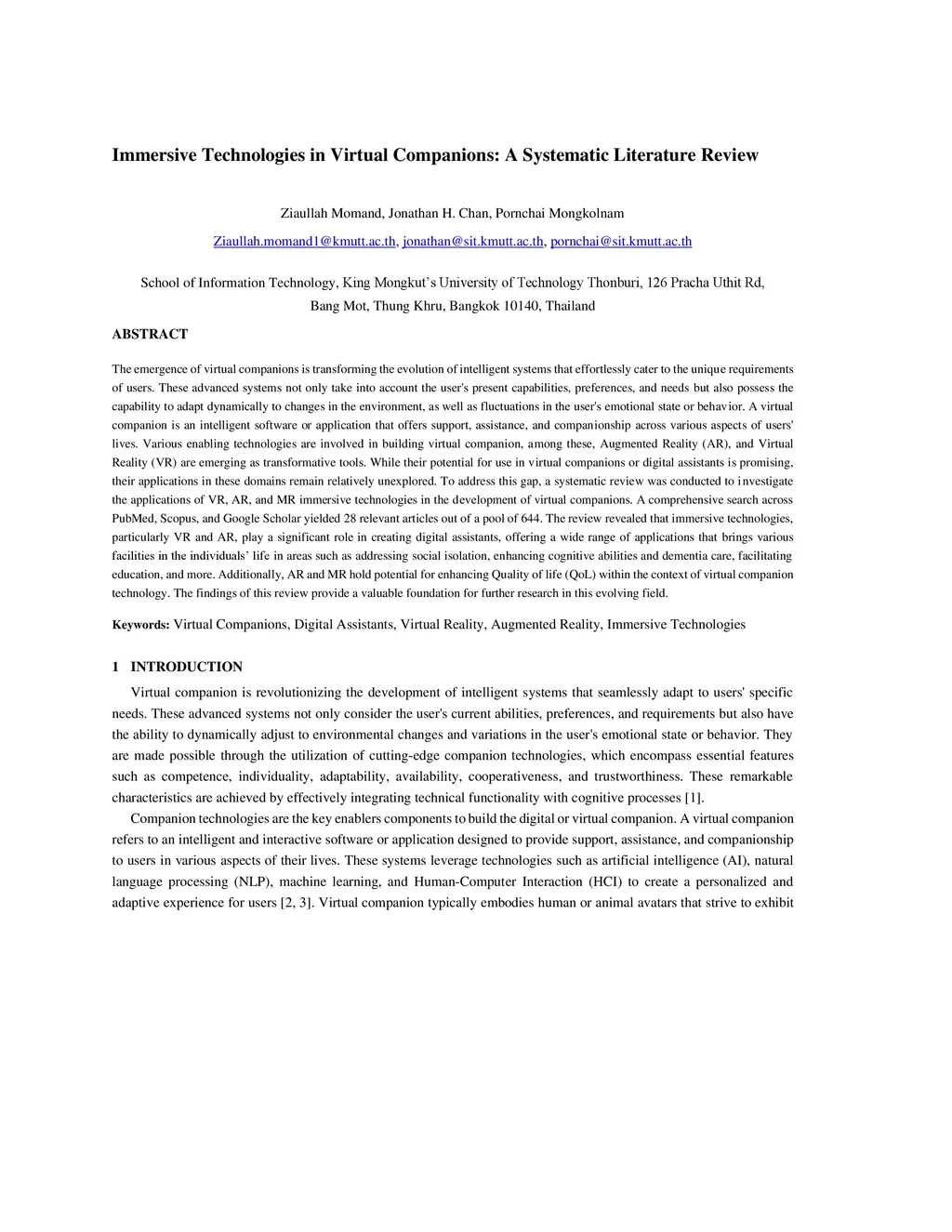 Immersive Technologies in Virtual Companions: A Systematic Literature