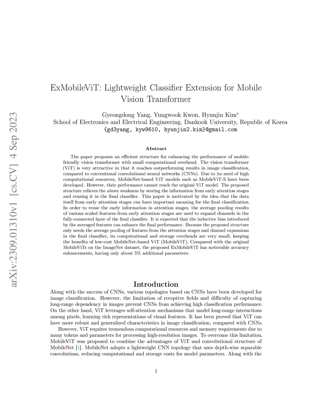 The paper proposes an efficient structure for enhancing the performance of mobile-friendly vision transformer with small computational overhead. The vision transformer (ViT) is very attractive in that it reaches outperforming results in image classification, compared to conventional convolutional neural networks (CNNs). Due to its need of high computational resources, MobileNet-based ViT models such as MobileViT-S have been developed. However, their performance cannot reach the original ViT model. The proposed structure relieves the above weakness by storing the information from early attention stages and reusing it in the final classifier. This paper is motivated by the idea that the data itself from early attention stages can have important meaning for the final classification. In order to reuse the early information in attention stages, the average pooling results of various scaled features from early attention stages are used to expand channels in the fully-connected layer of the final classifier. It is expected that the inductive bias introduced by the averaged features can enhance the final performance. Because the proposed structure only needs the average pooling of features from the attention stages and channel expansions in the final classifier, its computational and storage overheads are very small, keeping the benefits of low-cost MobileNet-based ViT (MobileViT). Compared with the original MobileViTs on the ImageNet dataset, the proposed ExMobileViT has noticeable accuracy enhancements, having only about 5% additional parameters.