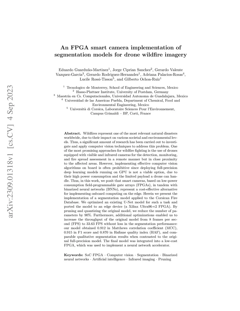 Wildfires represent one of the most relevant natural disasters worldwide, due to their impact on various societal and environmental levels. Thus, a significant amount of research has been carried out to investigate and apply computer vision techniques to address this problem. One of the most promising approaches for wildfire fighting is the use of drones equipped with visible and infrared cameras for the detection, monitoring, and fire spread assessment in a remote manner but in close proximity to the affected areas. However, implementing effective computer vision algorithms on board is often prohibitive since deploying full-precision deep learning models running on GPU is not a viable option, due to their high power consumption and the limited payload a drone can handle. Thus, in this work, we posit that smart cameras, based on low-power consumption field-programmable gate arrays (FPGAs), in tandem with binarized neural networks (BNNs), represent a cost-effective alternative for implementing onboard computing on the edge. Herein we present the implementation of a segmentation model applied to the Corsican Fire Database. We optimized an existing U-Net model for such a task and ported the model to an edge device (a Xilinx Ultra96-v2 FPGA). By pruning and quantizing the original model, we reduce the number of parameters by 90%. Furthermore, additional optimizations enabled us to increase the throughput of the original model from 8 frames per second (FPS) to 33.63 FPS without loss in the segmentation performance: our model obtained 0.912 in Matthews correlation coefficient (MCC),0.915 in F1 score and 0.870 in Hafiane quality index (HAF), and comparable qualitative segmentation results when contrasted to the original full-precision model. The final model was integrated into a low-cost FPGA, which was used to implement a neural network accelerator.