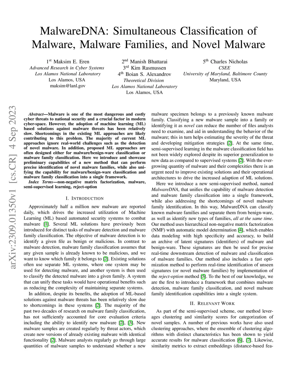 Malware is one of the most dangerous and costly cyber threats to national security and a crucial factor in modern cyber-space. However, the adoption of machine learning (ML) based solutions against malware threats has been relatively slow. Shortcomings in the existing ML approaches are likely contributing to this problem. The majority of current ML approaches ignore real-world challenges such as the detection of novel malware. In addition, proposed ML approaches are often designed either for malware/benign-ware classification or malware family classification. Here we introduce and showcase preliminary capabilities of a new method that can perform precise identification of novel malware families, while also unifying the capability for malware/benign-ware classification and malware family classification into a single framework.