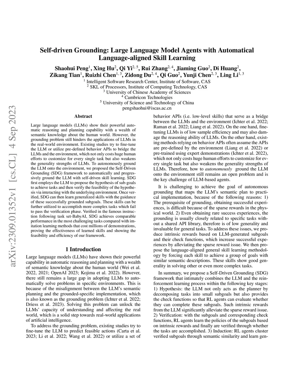 Large language models (LLMs) show their powerful automatic reasoning and planning capability with a wealth of semantic knowledge about the human world. However, the grounding problem still hinders the applications of LLMs in the real-world environment. Existing studies try to fine-tune the LLM or utilize pre-defined behavior APIs to bridge the LLMs and the environment, which not only costs huge human efforts to customize for every single task but also weakens the generality strengths of LLMs. To autonomously ground the LLM onto the environment, we proposed the Self-Driven Grounding (SDG) framework to automatically and progressively ground the LLM with self-driven skill learning. SDG first employs the LLM to propose the hypothesis of sub-goals to achieve tasks and then verify the feasibility of the hypothesis via interacting with the underlying environment. Once verified, SDG can then learn generalized skills with the guidance of these successfully grounded subgoals. These skills can be further utilized to accomplish more complex tasks which fail to pass the verification phase. Verified in the famous instruction following task set-BabyAI, SDG achieves comparable performance in the most challenging tasks compared with imitation learning methods that cost millions of demonstrations, proving the effectiveness of learned skills and showing the feasibility and efficiency of our framework.