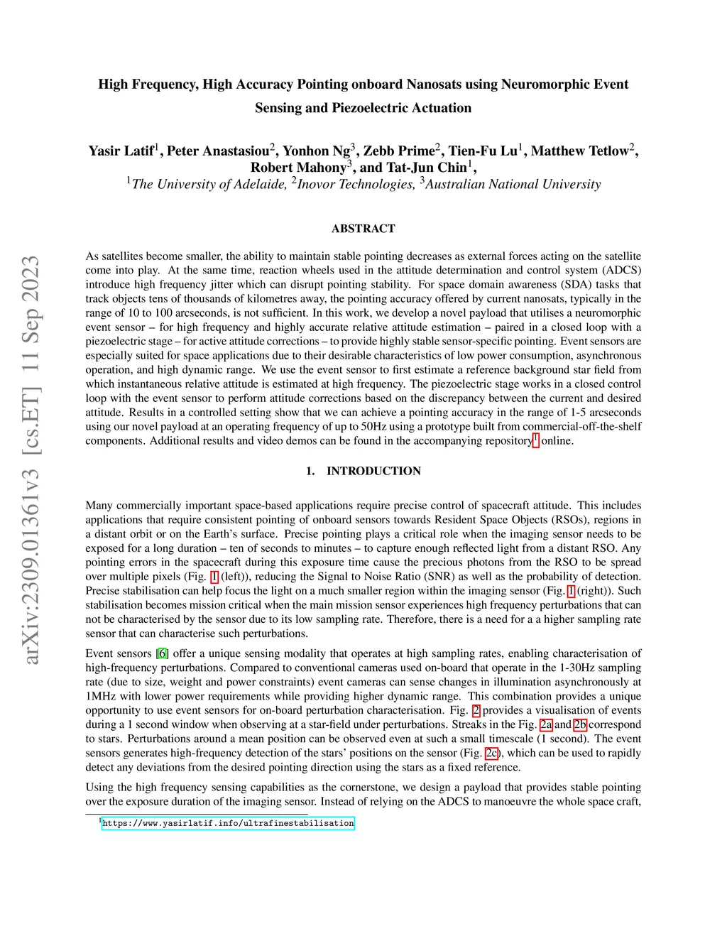 As satellites become smaller, the ability to maintain stable pointing decreases as external forces acting on the satellite come into play. At the same time, reaction wheels used in the attitude determination and control system (ADCS) introduce high frequency jitter which can disrupt pointing stability. For space domain awareness (SDA) tasks that track objects tens of thousands of kilometres away, the pointing accuracy offered by current nanosats, typically in the range of 10 to 100 arcseconds, is not sufficient. In this work, we develop a novel payload that utilises a neuromorphic event sensor (for high frequency and highly accurate relative attitude estimation) paired in a closed loop with a piezoelectric stage (for active attitude corrections) to provide highly stable sensor-specific pointing. Event sensors are especially suited for space applications due to their desirable characteristics of low power consumption, asynchronous operation, and high dynamic range. We use the event sensor to first estimate a reference background star field from which instantaneous relative attitude is estimated at high frequency. The piezoelectric stage works in a closed control loop with the event sensor to perform attitude corrections based on the discrepancy between the current and desired attitude. Results in a controlled setting show that we can achieve a pointing accuracy in the range of 1-5 arcseconds using our novel payload at an operating frequency of up to 50Hz using a prototype built from commercial-off-the-shelf components. Further details can be found at https://ylatif.github.io/ultrafinestabilisation