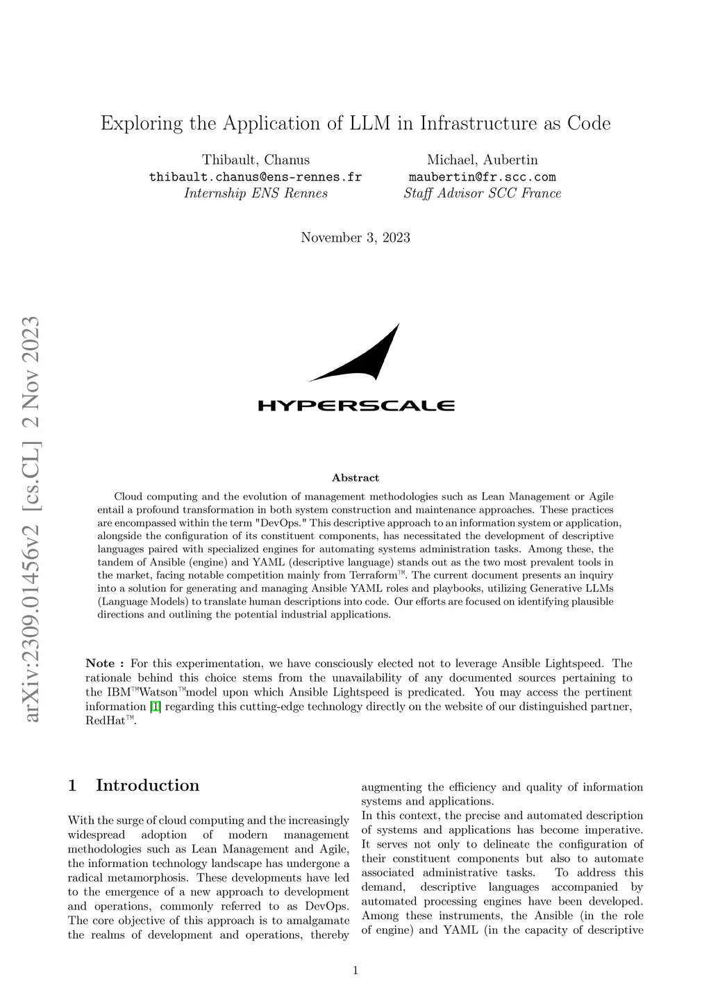 Cloud computing and the evolution of management methodologies such as Lean Management or Agile entail a profound transformation in both system construction and maintenance approaches. These practices are encompassed within the term "DevOps." This descriptive approach to an information system or application, alongside the configuration of its constituent components, has necessitated the development of descriptive languages paired with specialized engines for automating systems administration tasks. Among these, the tandem of Ansible (engine) and YAML (descriptive language) stands out as the two most prevalent tools in the market, facing notable competition mainly from Terraform. The current document presents an inquiry into a solution for generating and managing Ansible YAML roles and playbooks, utilizing Generative LLMs (Language Models) to translate human descriptions into code. Our efforts are focused on identifying plausible directions and outlining the potential industrial applications. Note: For the purpose of this experiment, we have opted against the use of Ansible Lightspeed. This is due to its reliance on an IBM Watson model, for which we have not found any publicly available references. Comprehensive information regarding this remarkable technology can be found [1] directly on our partner's website, RedHat.