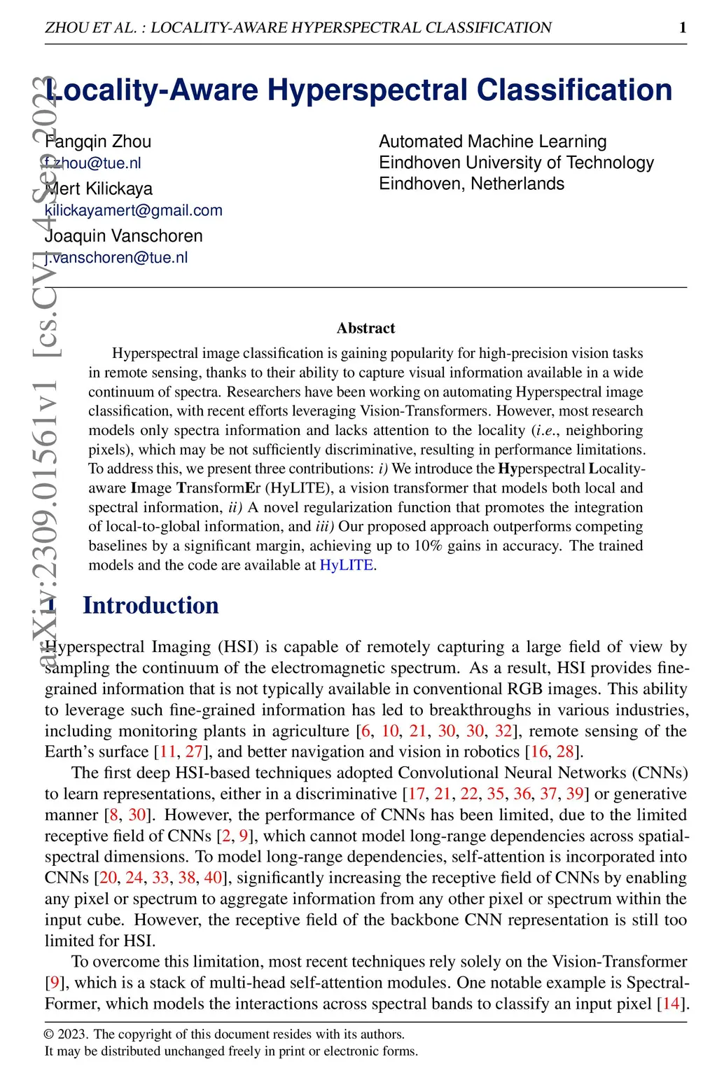 Hyperspectral image classification is gaining popularity for high-precision vision tasks in remote sensing, thanks to their ability to capture visual information available in a wide continuum of spectra. Researchers have been working on automating Hyperspectral image classification, with recent efforts leveraging Vision-Transformers. However, most research models only spectra information and lacks attention to the locality (i.e., neighboring pixels), which may be not sufficiently discriminative, resulting in performance limitations. To address this, we present three contributions: i) We introduce the Hyperspectral Locality-aware Image TransformEr (HyLITE), a vision transformer that models both local and spectral information, ii) A novel regularization function that promotes the integration of local-to-global information, and iii) Our proposed approach outperforms competing baselines by a significant margin, achieving up to 10% gains in accuracy. The trained models and the code are available at HyLITE.
