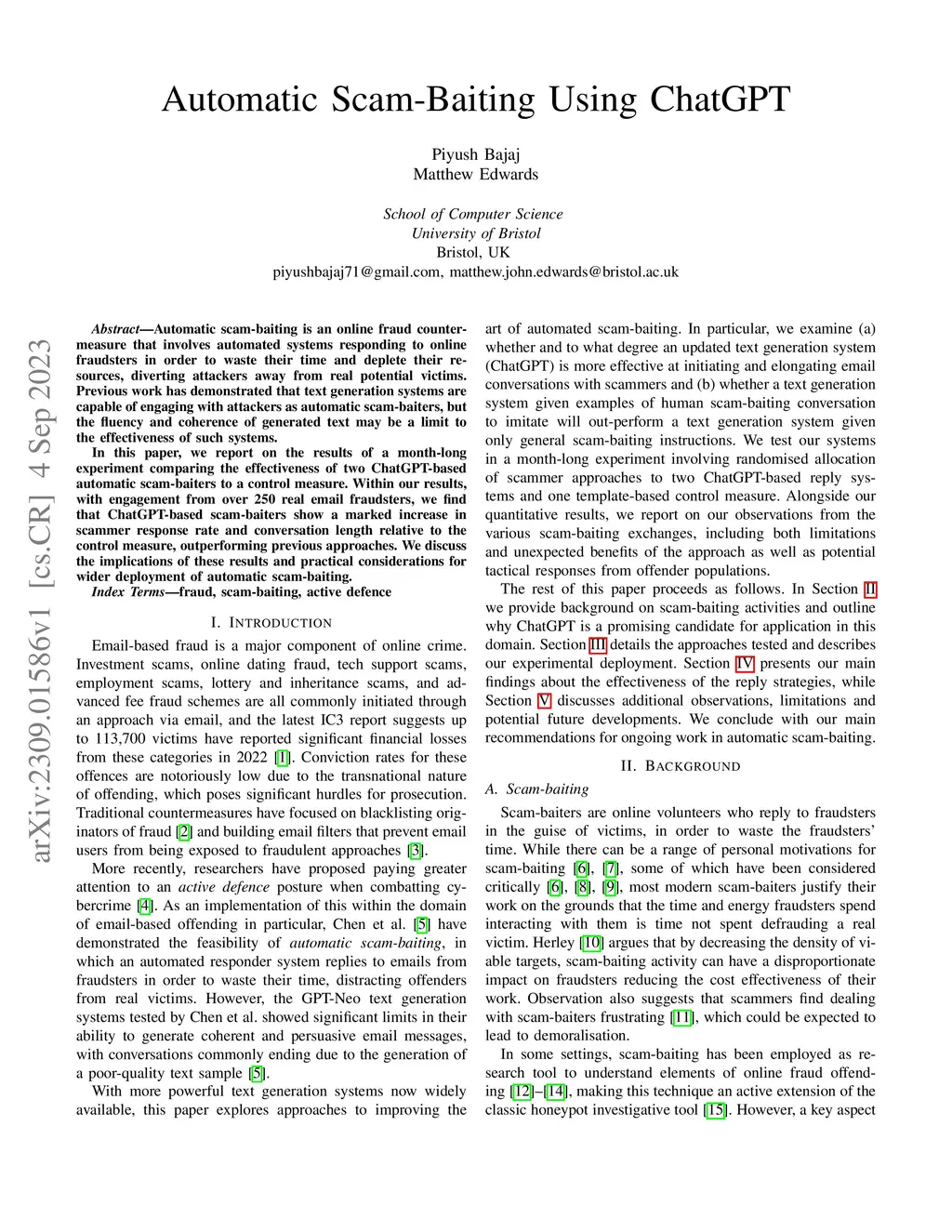 Automatic scam-baiting is an online fraud countermeasure that involves automated systems responding to online fraudsters in order to waste their time and deplete their resources, diverting attackers away from real potential victims. Previous work has demonstrated that text generation systems are capable of engaging with attackers as automatic scam-baiters, but the fluency and coherence of generated text may be a limit to the effectiveness of such systems. In this paper, we report on the results of a month-long experiment comparing the effectiveness of two ChatGPT-based automatic scam-baiters to a control measure. Within our results, with engagement from over 250 real email fraudsters, we find that ChatGPT-based scam-baiters show a marked increase in scammer response rate and conversation length relative to the control measure, outperforming previous approaches. We discuss the implications of these results and practical considerations for wider deployment of automatic scam-baiting.