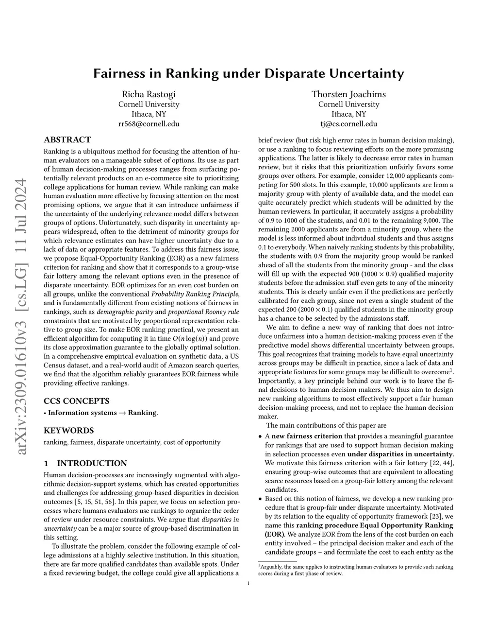 Ranking is a ubiquitous method for focusing the attention of human evaluators on a manageable subset of options. Its use as part of human decision-making processes ranges from surfacing potentially relevant products on an e-commerce site to prioritizing college applications for human review. While ranking can make human evaluation more effective by focusing attention on the most promising options, we argue that it can introduce unfairness if the uncertainty of the underlying relevance model differs between groups of options. Unfortunately, such disparity in uncertainty appears widespread, often to the detriment of minority groups for which relevance estimates can have higher uncertainty due to a lack of data or appropriate features. To address this fairness issue, we propose Equal-Opportunity Ranking (EOR) as a new fairness criterion for ranking and show that it corresponds to a group-wise fair lottery among the relevant options even in the presence of disparate uncertainty. EOR optimizes for an even cost burden on all groups, unlike the conventional Probability Ranking Principle, and is fundamentally different from existing notions of fairness in rankings, such as demographic parity and proportional Rooney rule constraints that are motivated by proportional representation relative to group size. To make EOR ranking practical, we present an efficient algorithm for computing it in time and prove its close approximation guarantee to the globally optimal solution. In a comprehensive empirical evaluation on synthetic data, a US Census dataset, and a real-world audit of Amazon search queries, we find that the algorithm reliably guarantees EOR fairness while providing effective rankings.