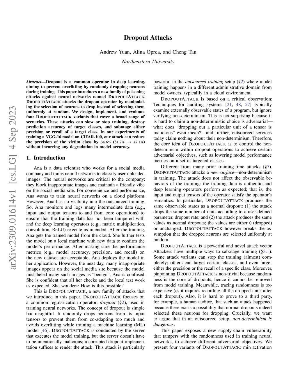 Dropout is a common operator in deep learning, aiming to prevent overfitting by randomly dropping neurons during training. This paper introduces a new family of poisoning attacks against neural networks named DROPOUTATTACK. DROPOUTATTACK attacks the dropout operator by manipulating the selection of neurons to drop instead of selecting them uniformly at random. We design, implement, and evaluate four DROPOUTATTACK variants that cover a broad range of scenarios. These attacks can slow or stop training, destroy prediction accuracy of target classes, and sabotage either precision or recall of a target class. In our experiments of training a VGG-16 model on CIFAR-100, our attack can reduce the precision of the victim class by 34.6% (from 81.7% to 47.1%) without incurring any degradation in model accuracy