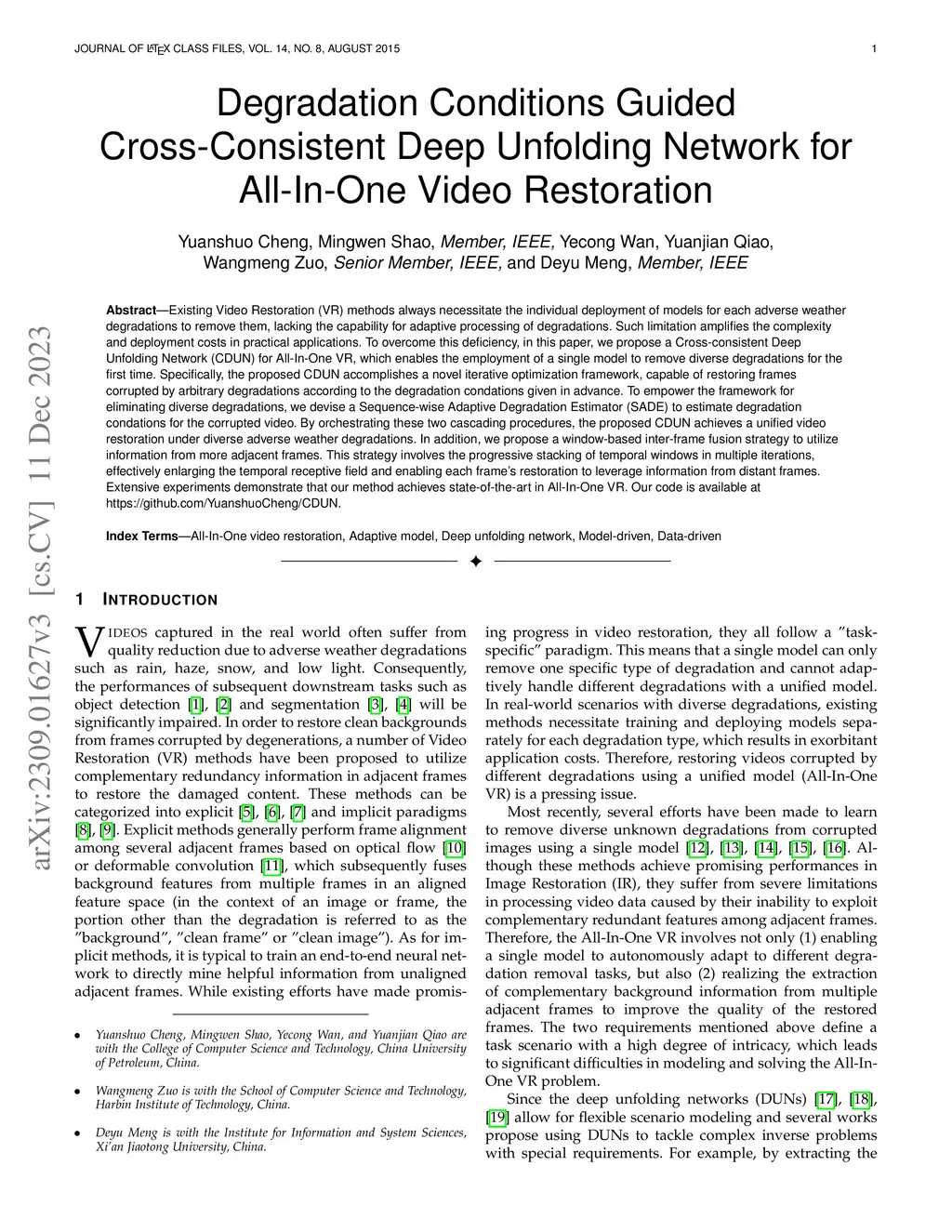 Existing Video Restoration (VR) methods always necessitate the individual deployment of models for each adverse weather to remove diverse adverse weather degradations, lacking the capability for adaptive processing of degradations. Such limitation amplifies the complexity and deployment costs in practical applications. To overcome this deficiency, in this paper, we propose a Cross-consistent Deep Unfolding Network (CDUN) for All-In-One VR, which enables the employment of a single model to remove diverse degradations for the first time. Specifically, the proposed CDUN accomplishes a novel iterative optimization framework, capable of restoring frames corrupted by corresponding degradations according to the degradation features given in advance. To empower the framework for eliminating diverse degradations, we devise a Sequence-wise Adaptive Degradation Estimator (SADE) to estimate degradation features for the input corrupted video. By orchestrating these two cascading procedures, CDUN achieves adaptive processing for diverse degradation. In addition, we introduce a window-based inter-frame fusion strategy to utilize information from more adjacent frames. This strategy involves the progressive stacking of temporal windows in multiple iterations, effectively enlarging the temporal receptive field and enabling each frame's restoration to leverage information from distant frames. Extensive experiments demonstrate that the proposed method achieves state-of-the-art performance in All-In-One VR.