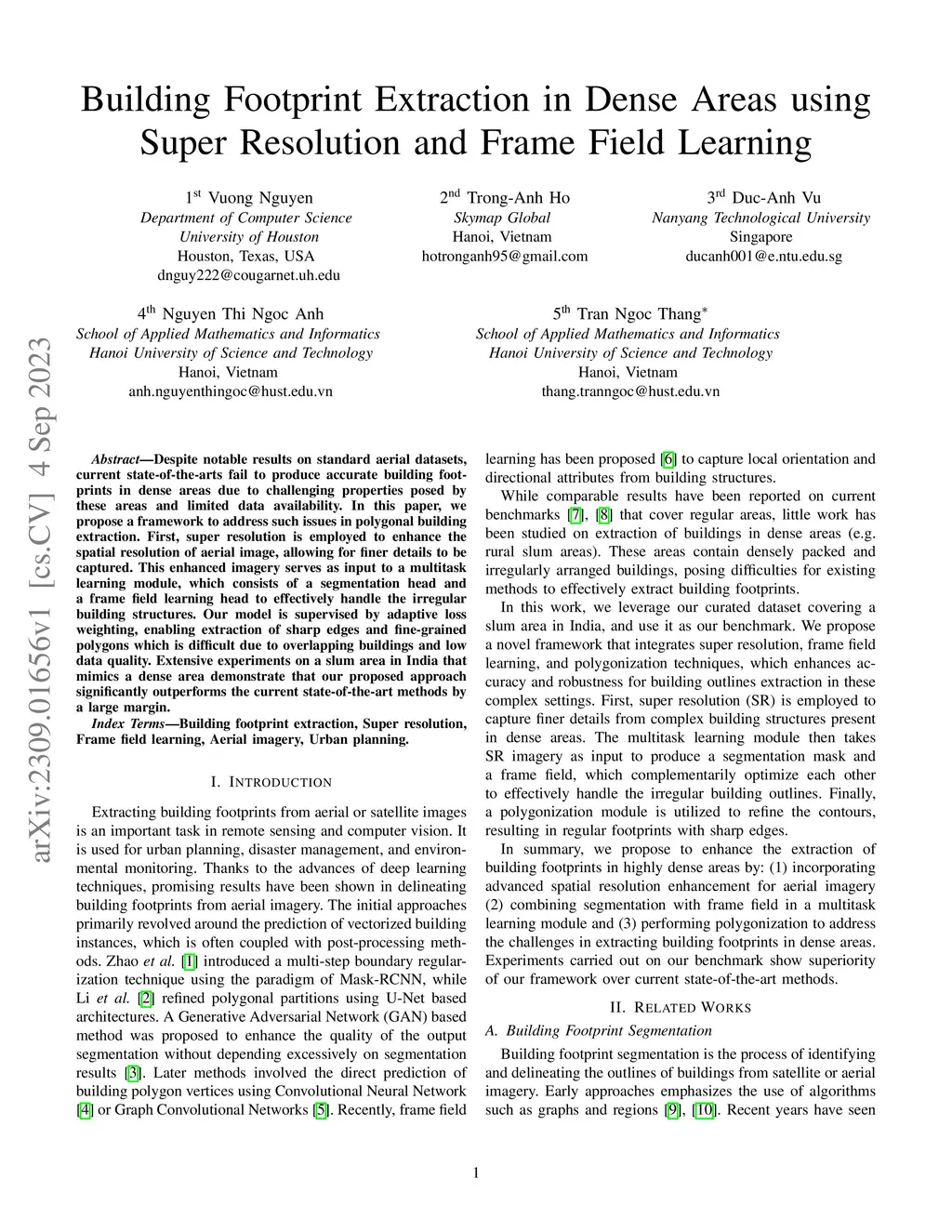 Despite notable results on standard aerial datasets, current state-of-the-arts fail to produce accurate building footprints in dense areas due to challenging properties posed by these areas and limited data availability. In this paper, we propose a framework to address such issues in polygonal building extraction. First, super resolution is employed to enhance the spatial resolution of aerial image, allowing for finer details to be captured. This enhanced imagery serves as input to a multitask learning module, which consists of a segmentation head and a frame field learning head to effectively handle the irregular building structures. Our model is supervised by adaptive loss weighting, enabling extraction of sharp edges and fine-grained polygons which is difficult due to overlapping buildings and low data quality. Extensive experiments on a slum area in India that mimics a dense area demonstrate that our proposed approach significantly outperforms the current state-of-the-art methods by a large margin.
