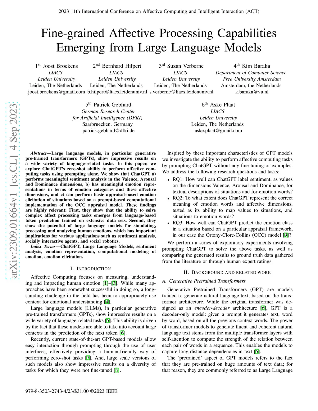 Large language models, in particular generative pre-trained transformers (GPTs), show impressive results on a wide variety of language-related tasks. In this paper, we explore ChatGPT's zero-shot ability to perform affective computing tasks using prompting alone. We show that ChatGPT a) performs meaningful sentiment analysis in the Valence, Arousal and Dominance dimensions, b) has meaningful emotion representations in terms of emotion categories and these affective dimensions, and c) can perform basic appraisal-based emotion elicitation of situations based on a prompt-based computational implementation of the OCC appraisal model. These findings are highly relevant: First, they show that the ability to solve complex affect processing tasks emerges from language-based token prediction trained on extensive data sets. Second, they show the potential of large language models for simulating, processing and analyzing human emotions, which has important implications for various applications such as sentiment analysis, socially interactive agents, and social robotics.