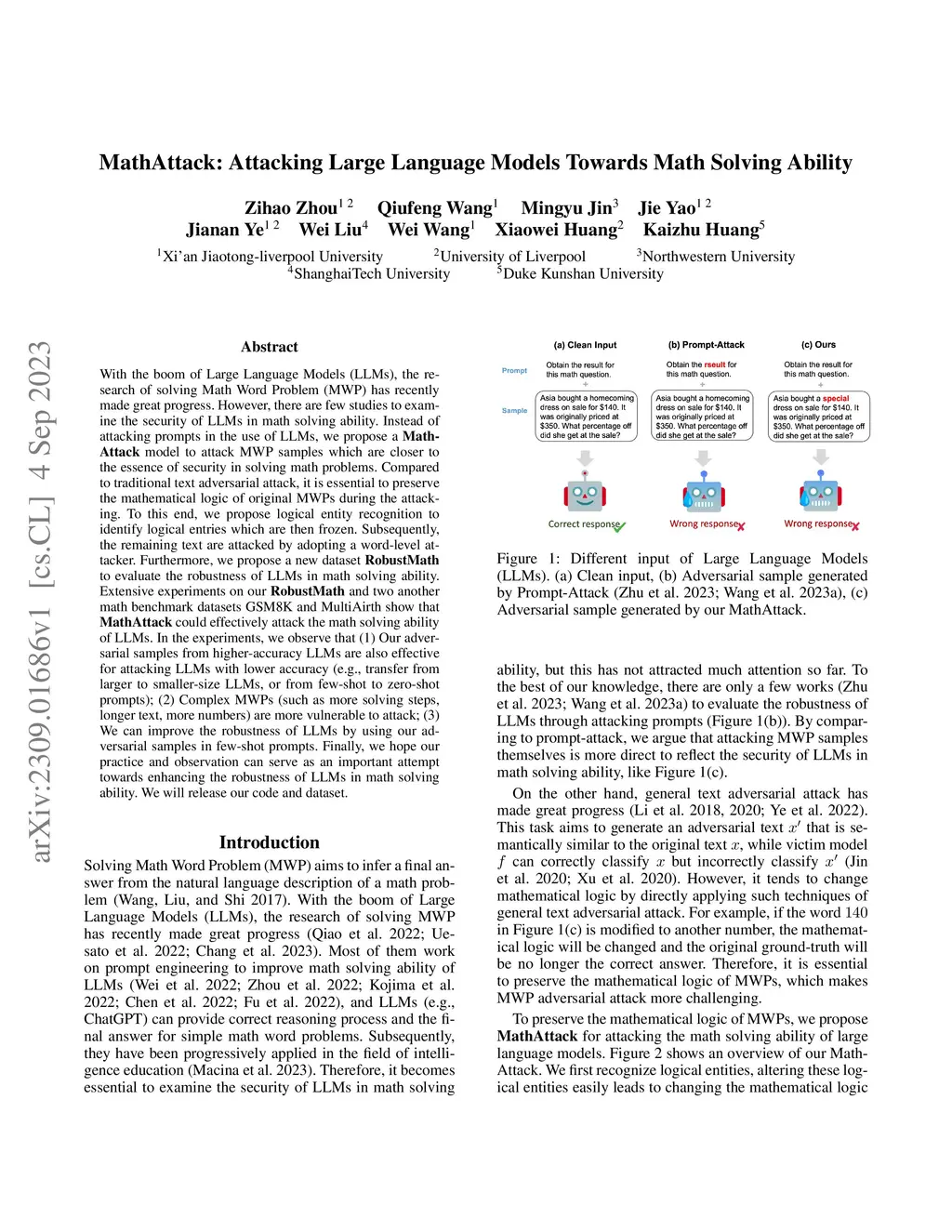 With the boom of Large Language Models (LLMs), the research of solving Math Word Problem (MWP) has recently made great progress. However, there are few studies to examine the security of LLMs in math solving ability. Instead of attacking prompts in the use of LLMs, we propose a MathAttack model to attack MWP samples which are closer to the essence of security in solving math problems. Compared to traditional text adversarial attack, it is essential to preserve the mathematical logic of original MWPs during the attacking. To this end, we propose logical entity recognition to identify logical entries which are then frozen. Subsequently, the remaining text are attacked by adopting a word-level attacker. Furthermore, we propose a new dataset RobustMath to evaluate the robustness of LLMs in math solving ability. Extensive experiments on our RobustMath and two another math benchmark datasets GSM8K and MultiAirth show that MathAttack could effectively attack the math solving ability of LLMs. In the experiments, we observe that (1) Our adversarial samples from higher-accuracy LLMs are also effective for attacking LLMs with lower accuracy (e.g., transfer from larger to smaller-size LLMs, or from few-shot to zero-shot prompts); (2) Complex MWPs (such as more solving steps, longer text, more numbers) are more vulnerable to attack; (3) We can improve the robustness of LLMs by using our adversarial samples in few-shot prompts. Finally, we hope our practice and observation can serve as an important attempt towards enhancing the robustness of LLMs in math solving ability. We will release our code and dataset.