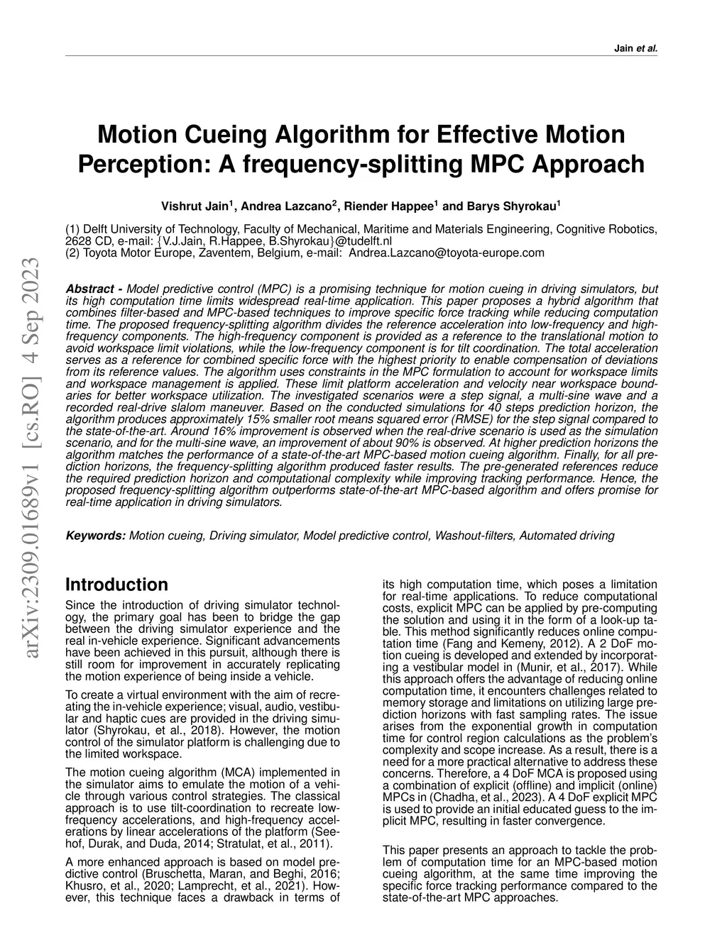 Motion Cueing Algorithm for Effective Motion Perception: A