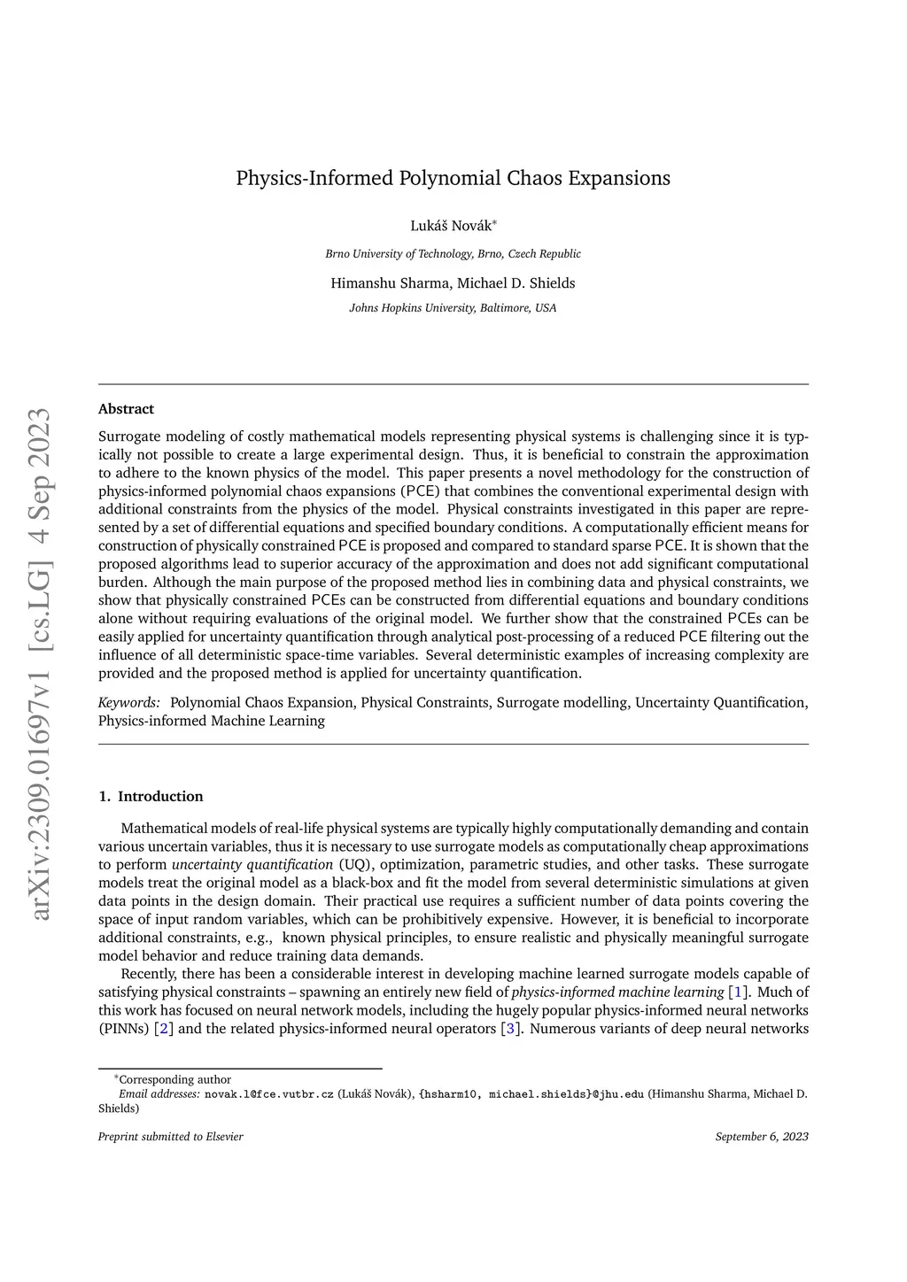Surrogate modeling of costly mathematical models representing physical systems is challenging since it is typically not possible to create a large experimental design. Thus, it is beneficial to constrain the approximation to adhere to the known physics of the model. This paper presents a novel methodology for the construction of physics-informed polynomial chaos expansions (PCE) that combines the conventional experimental design with additional constraints from the physics of the model. Physical constraints investigated in this paper are represented by a set of differential equations and specified boundary conditions. A computationally efficient means for construction of physically constrained PCE is proposed and compared to standard sparse PCE. It is shown that the proposed algorithms lead to superior accuracy of the approximation and does not add significant computational burden. Although the main purpose of the proposed method lies in combining data and physical constraints, we show that physically constrained PCEs can be constructed from differential equations and boundary conditions alone without requiring evaluations of the original model. We further show that the constrained PCEs can be easily applied for uncertainty quantification through analytical post-processing of a reduced PCE filtering out the influence of all deterministic space-time variables. Several deterministic examples of increasing complexity are provided and the proposed method is applied for uncertainty quantification.