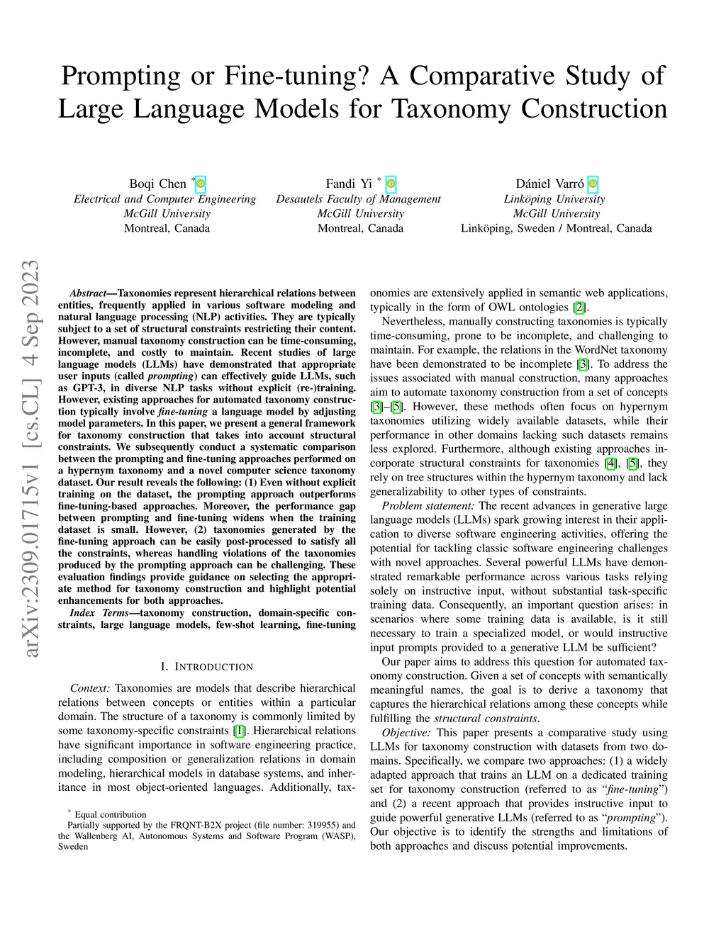 Taxonomies represent hierarchical relations between entities, frequently applied in various software modeling and natural language processing (NLP) activities. They are typically subject to a set of structural constraints restricting their content. However, manual taxonomy construction can be time-consuming, incomplete, and costly to maintain. Recent studies of large language models (LLMs) have demonstrated that appropriate user inputs (called prompting) can effectively guide LLMs, such as GPT-3, in diverse NLP tasks without explicit (re-)training. However, existing approaches for automated taxonomy construction typically involve fine-tuning a language model by adjusting model parameters. In this paper, we present a general framework for taxonomy construction that takes into account structural constraints. We subsequently conduct a systematic comparison between the prompting and fine-tuning approaches performed on a hypernym taxonomy and a novel computer science taxonomy dataset. Our result reveals the following: (1) Even without explicit training on the dataset, the prompting approach outperforms fine-tuning-based approaches. Moreover, the performance gap between prompting and fine-tuning widens when the training dataset is small. However, (2) taxonomies generated by the fine-tuning approach can be easily post-processed to satisfy all the constraints, whereas handling violations of the taxonomies produced by the prompting approach can be challenging. These evaluation findings provide guidance on selecting the appropriate method for taxonomy construction and highlight potential enhancements for both approaches.