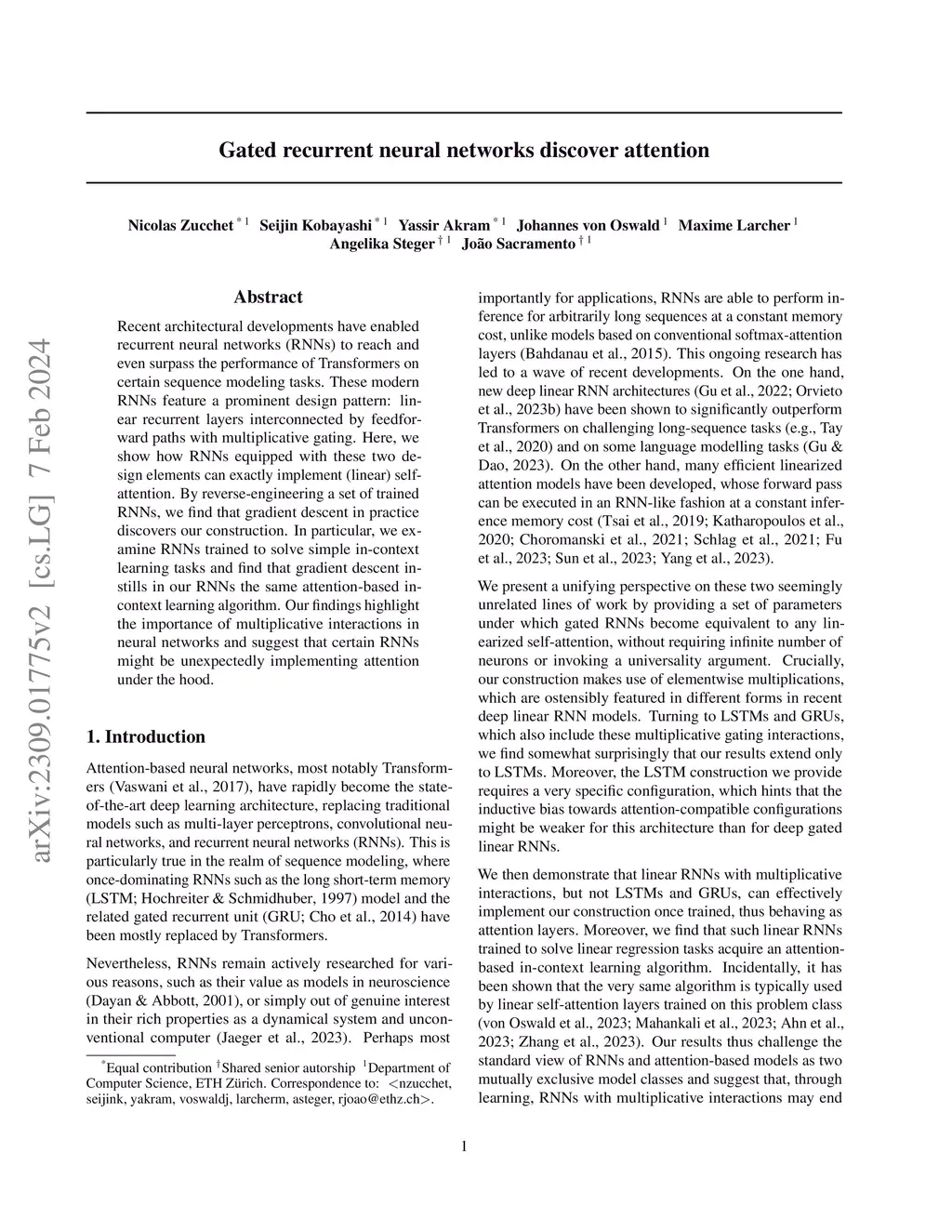 Recent architectural developments have enabled recurrent neural networks (RNNs) to reach and even surpass the performance of Transformers on certain sequence modeling tasks. These modern RNNs feature a prominent design pattern: linear recurrent layers interconnected by feedforward paths with multiplicative gating. Here, we show how RNNs equipped with these two design elements can exactly implement (linear) self-attention, the main building block of Transformers. By reverse-engineering a set of trained RNNs, we find that gradient descent in practice discovers our construction. In particular, we examine RNNs trained to solve simple in-context learning tasks on which Transformers are known to excel and find that gradient descent instills in our RNNs the same attention-based in-context learning algorithm used by Transformers. Our findings highlight the importance of multiplicative interactions in neural networks and suggest that certain RNNs might be unexpectedly implementing attention under the hood.