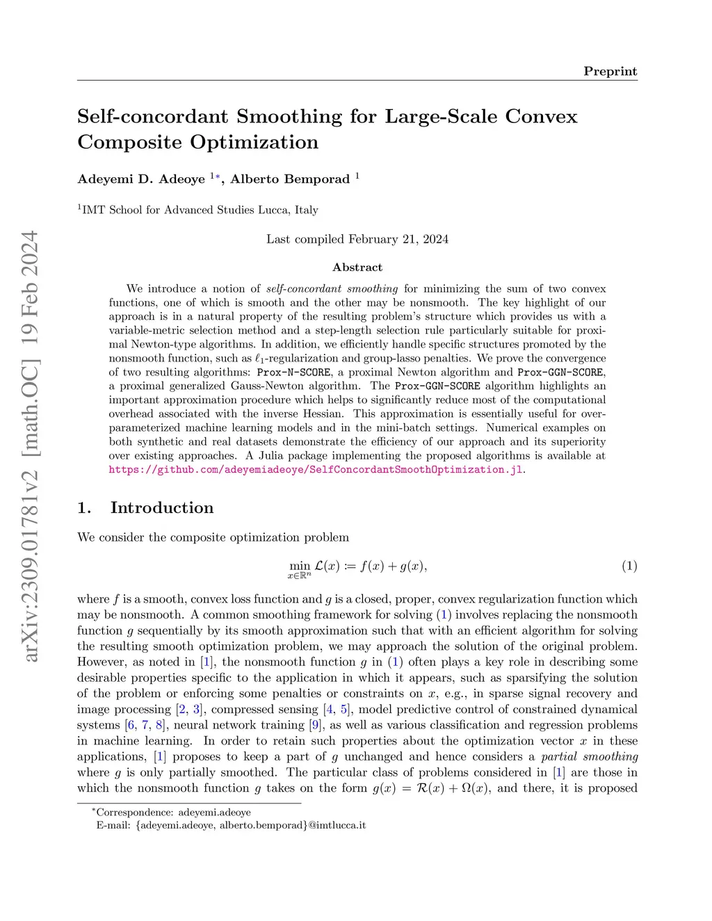We introduce a notion of self-concordant smoothing for minimizing the sum of two convex functions, one of which is smooth and the other nonsmooth. The key highlight is a natural property of the resulting problem's structure that yields a variable metric selection method and a step length rule especially suited to proximal quasi-Newton algorithms. Also, we efficiently handle specific structures promoted by the nonsmooth term, such as l1-regularization and group lasso penalties. A convergence analysis for the class of proximal quasi-Newton methods covered by our framework is presented. In particular, we obtain guarantees, under standard assumptions, for two algorithms: Prox-N-SCORE (a proximal Newton method) and Prox-GGN-SCORE (a proximal generalized Gauss-Newton method). The latter uses a low-rank approximation of the Hessian inverse, reducing most of the cost of matrix inversion and making it effective for overparameterized machine learning models. Numerical experiments on synthetic and real data demonstrate the efficiency of both algorithms against state-of-the-art approaches. A Julia implementation is publicly available atthis https URL.