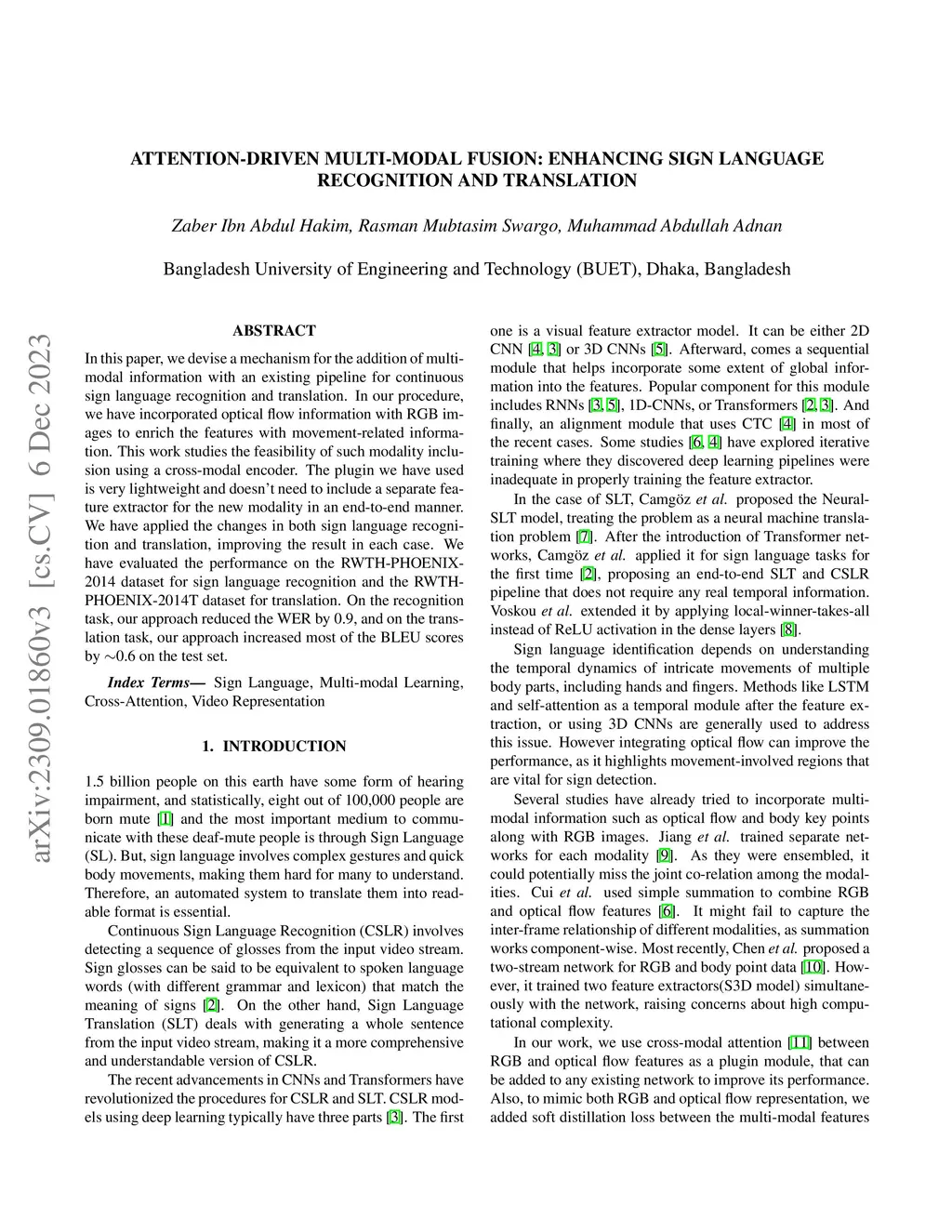 In this paper, we devise a mechanism for the addition of multi-modal information with an existing pipeline for continuous sign language recognition and translation. In our procedure, we have incorporated optical flow information with RGB images to enrich the features with movement-related information. This work studies the feasibility of such modality inclusion using a cross-modal encoder. The plugin we have used is very lightweight and doesn't need to include a separate feature extractor for the new modality in an end-to-end manner. We have applied the changes in both sign language recognition and translation, improving the result in each case. We have evaluated the performance on the RWTH-PHOENIX-2014 dataset for sign language recognition and the RWTH-PHOENIX-2014T dataset for translation. On the recognition task, our approach reduced the WER by 0.9, and on the translation task, our approach increased most of the BLEU scores by ~0.6 on the test set.