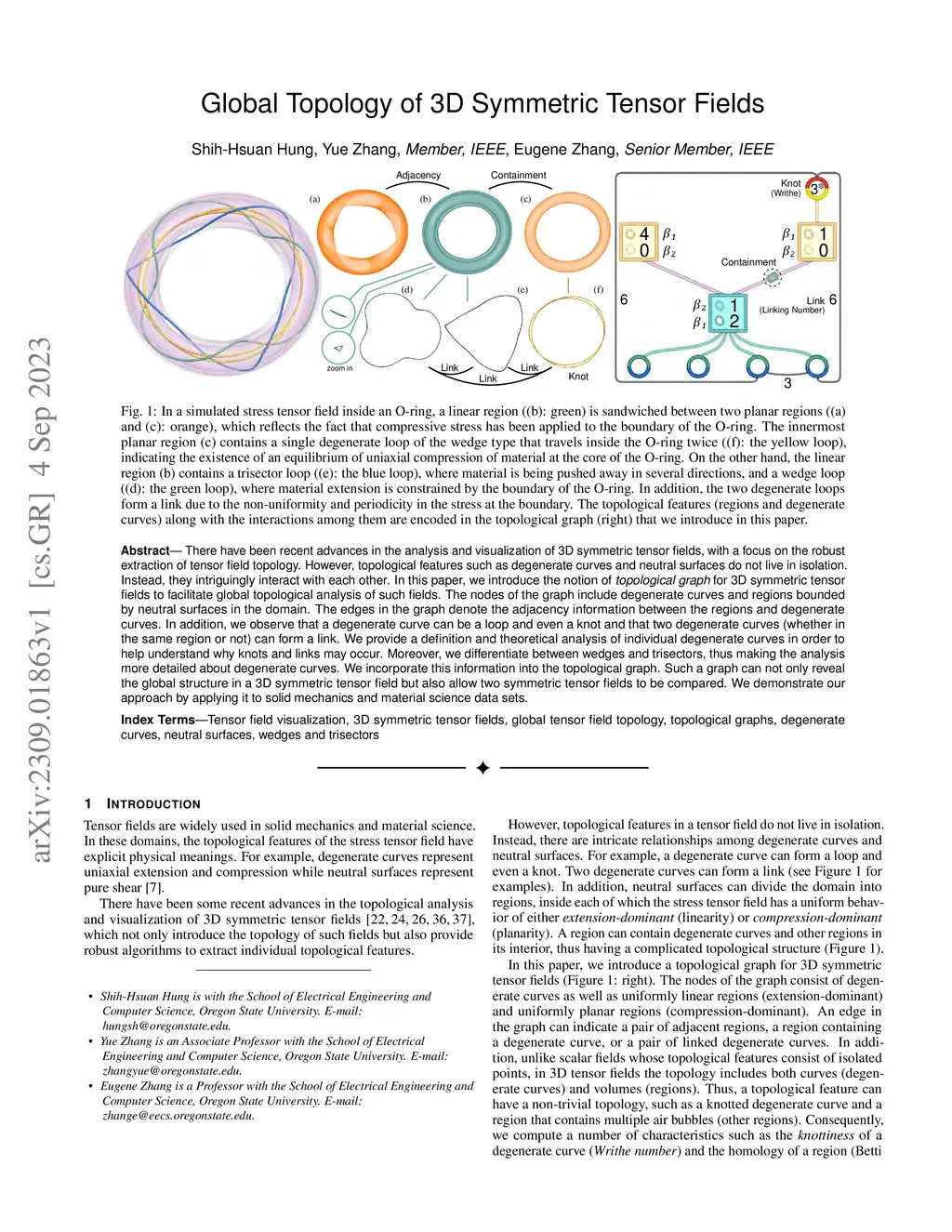 There have been recent advances in the analysis and visualization of 3D symmetric tensor fields, with a focus on the robust extraction of tensor field topology. However, topological features such as degenerate curves and neutral surfaces do not live in isolation. Instead, they intriguingly interact with each other. In this paper, we introduce the notion of {\em topological graph} for 3D symmetric tensor fields to facilitate global topological analysis of such fields. The nodes of the graph include degenerate curves and regions bounded by neutral surfaces in the domain. The edges in the graph denote the adjacency information between the regions and degenerate curves. In addition, we observe that a degenerate curve can be a loop and even a knot and that two degenerate curves (whether in the same region or not) can form a link. We provide a definition and theoretical analysis of individual degenerate curves in order to help understand why knots and links may occur. Moreover, we differentiate between wedges and trisectors, thus making the analysis more detailed about degenerate curves. We incorporate this information into the topological graph. Such a graph can not only reveal the global structure in a 3D symmetric tensor field but also allow two symmetric tensor fields to be compared. We demonstrate our approach by applying it to solid mechanics and material science data sets.
