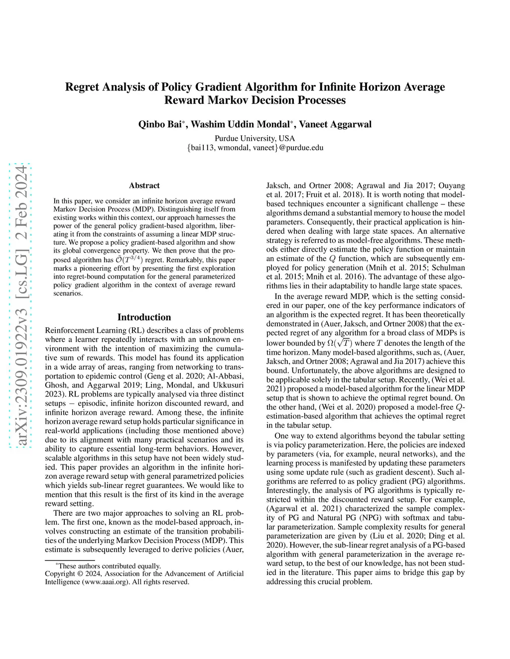 In this paper, we consider an infinite horizon average reward Markov Decision Process (MDP). Distinguishing itself from existing works within this context, our approach harnesses the power of the general policy gradient-based algorithm, liberating it from the constraints of assuming a linear MDP structure. We propose a policy gradient-based algorithm and show its global convergence property. We then prove that the proposed algorithm has regret. Remarkably, this paper marks a pioneering effort by presenting the first exploration into regret-bound computation for the general parameterized policy gradient algorithm in the context of average reward scenarios.