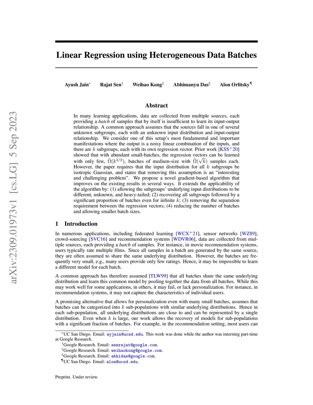 In many learning applications, data are collected from multiple sources, each providing a \emph{batch} of samples that by itself is insufficient to learn its input-output relationship. A common approach assumes that the sources fall in one of several unknown subgroups, each with an unknown input distribution and input-output relationship. We consider one of this setup's most fundamental and important manifestations where the output is a noisy linear combination of the inputs, and there are subgroups, each with its own regression vector. Prior work~\cite{kong2020meta} showed that with abundant small-batches, the regression vectors can be learned with only few, , batches of medium-size with samples each. However, the paper requires that the input distribution for all subgroups be isotropic Gaussian, and states that removing this assumption is an ``interesting and challenging problem". We propose a novel gradient-based algorithm that improves on the existing results in several ways. It extends the applicability of the algorithm by: (1) allowing the subgroups' underlying input distributions to be different, unknown, and heavy-tailed; (2) recovering all subgroups followed by a significant proportion of batches even for infinite ; (3) removing the separation requirement between the regression vectors; (4) reducing the number of batches and allowing smaller batch sizes.