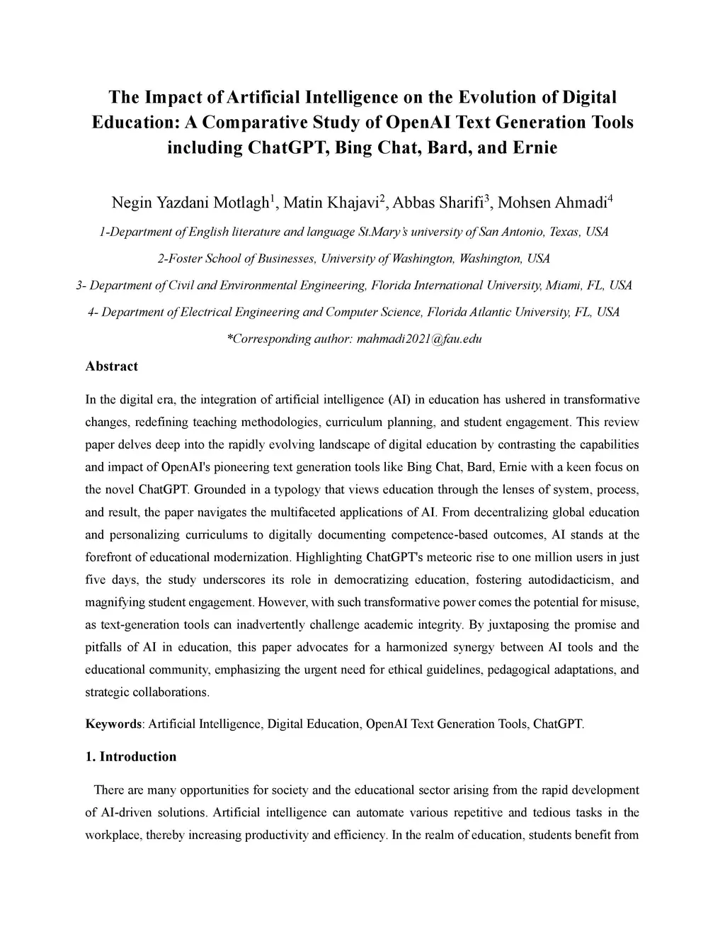 The Impact of Artificial Intelligence on the Evolution of Digital Education: A Comparative Study of OpenAI Text Generation Tools including ChatGPT, Bing Chat, Bard, and Ernie