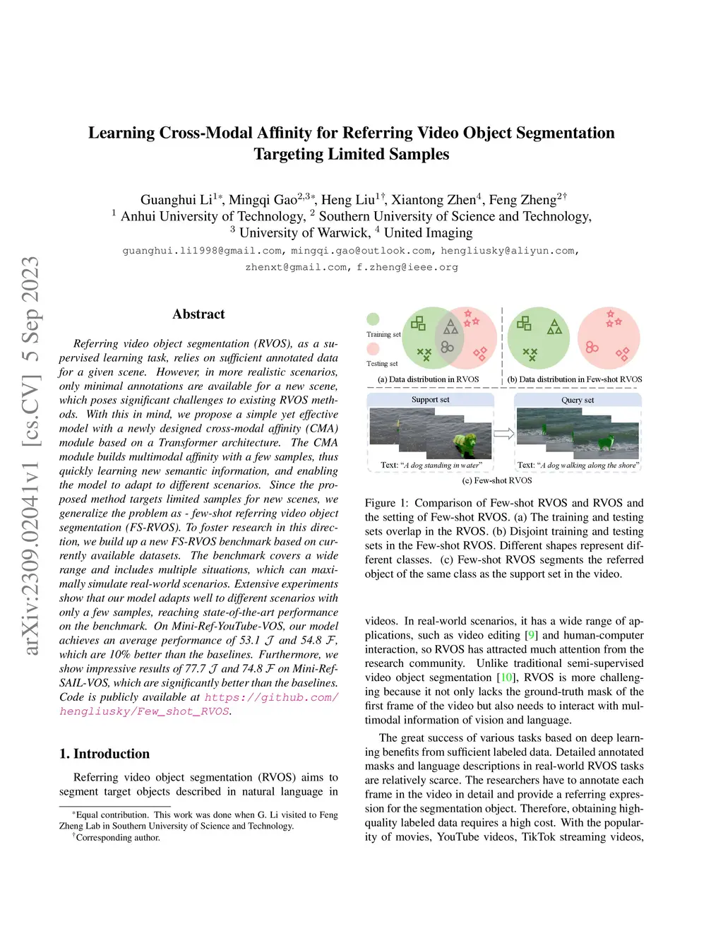 Referring video object segmentation (RVOS), as a supervised learning task, relies on sufficient annotated data for a given scene. However, in more realistic scenarios, only minimal annotations are available for a new scene, which poses significant challenges to existing RVOS methods. With this in mind, we propose a simple yet effective model with a newly designed cross-modal affinity (CMA) module based on a Transformer architecture. The CMA module builds multimodal affinity with a few samples, thus quickly learning new semantic information, and enabling the model to adapt to different scenarios. Since the proposed method targets limited samples for new scenes, we generalize the problem as - few-shot referring video object segmentation (FS-RVOS). To foster research in this direction, we build up a new FS-RVOS benchmark based on currently available datasets. The benchmark covers a wide range and includes multiple situations, which can maximally simulate real-world scenarios. Extensive experiments show that our model adapts well to different scenarios with only a few samples, reaching state-of-the-art performance on the benchmark. On Mini-Ref-YouTube-VOS, our model achieves an average performance of 53.1 J and 54.8 F, which are 10% better than the baselines. Furthermore, we show impressive results of 77.7 J and 74.8 F on Mini-Ref-SAIL-VOS, which are significantly better than the baselines. Code is publicly available at https://github.com/hengliusky/Few_shot_RVOS.