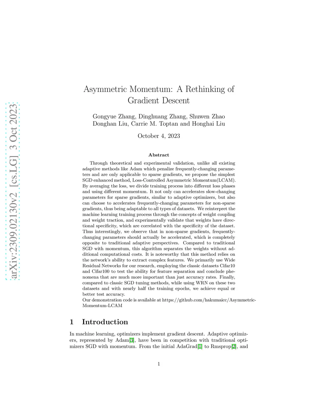 Through theoretical and experimental validation, unlike all existing adaptive methods like Adam which penalize frequently-changing parameters and are only applicable to sparse gradients, we propose the simplest SGD enhanced method, Loss-Controlled Asymmetric Momentum(LCAM). By averaging the loss, we divide training process into different loss phases and using different momentum. It not only can accelerates slow-changing parameters for sparse gradients, similar to adaptive optimizers, but also can choose to accelerates frequently-changing parameters for non-sparse gradients, thus being adaptable to all types of datasets. We reinterpret the machine learning training process through the concepts of weight coupling and weight traction, and experimentally validate that weights have directional specificity, which are correlated with the specificity of the dataset. Thus interestingly, we observe that in non-sparse gradients, frequently-changing parameters should actually be accelerated, which is completely opposite to traditional adaptive perspectives. Compared to traditional SGD with momentum, this algorithm separates the weights without additional computational costs. It is noteworthy that this method relies on the network's ability to extract complex features. We primarily use Wide Residual Networks for our research, employing the classic datasets Cifar10 and Cifar100 to test the ability for feature separation and conclude phenomena that are much more important than just accuracy rates. Finally, compared to classic SGD tuning methods, while using WRN on these two datasets and with nearly half the training epochs, we achieve equal or better test accuracy.