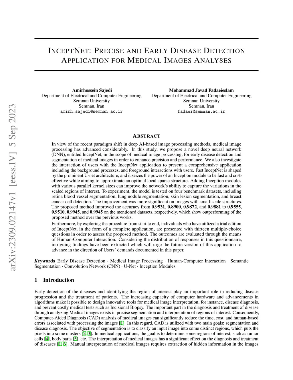 In view of the recent paradigm shift in deep AI based image processing methods, medical image processing has advanced considerably. In this study, we propose a novel deep neural network (DNN), entitled InceptNet, in the scope of medical image processing, for early disease detection and segmentation of medical images in order to enhance precision and performance. We also investigate the interaction of users with the InceptNet application to present a comprehensive application including the background processes, and foreground interactions with users. Fast InceptNet is shaped by the prominent Unet architecture, and it seizes the power of an Inception module to be fast and cost effective while aiming to approximate an optimal local sparse structure. Adding Inception modules with various parallel kernel sizes can improve the network's ability to capture the variations in the scaled regions of interest. To experiment, the model is tested on four benchmark datasets, including retina blood vessel segmentation, lung nodule segmentation, skin lesion segmentation, and breast cancer cell detection. The improvement was more significant on images with small scale structures. The proposed method improved the accuracy from 0.9531, 0.8900, 0.9872, and 0.9881 to 0.9555, 0.9510, 0.9945, and 0.9945 on the mentioned datasets, respectively, which show outperforming of the proposed method over the previous works. Furthermore, by exploring the procedure from start to end, individuals who have utilized a trial edition of InceptNet, in the form of a complete application, are presented with thirteen multiple choice questions in order to assess the proposed method. The outcomes are evaluated through the means of Human Computer Interaction.