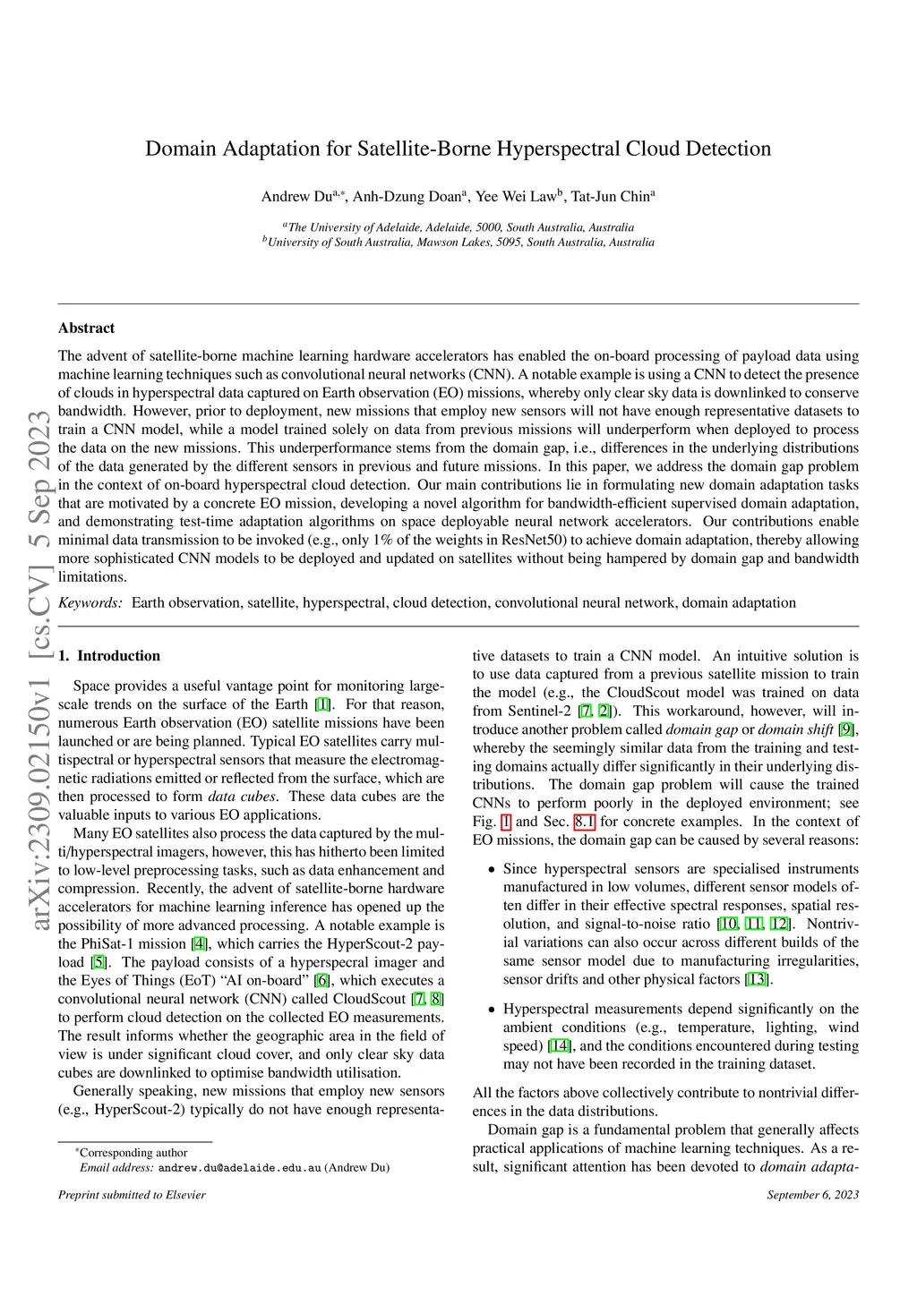 Domain Adaptation for Satellite-Borne Hyperspectral Cloud Detection