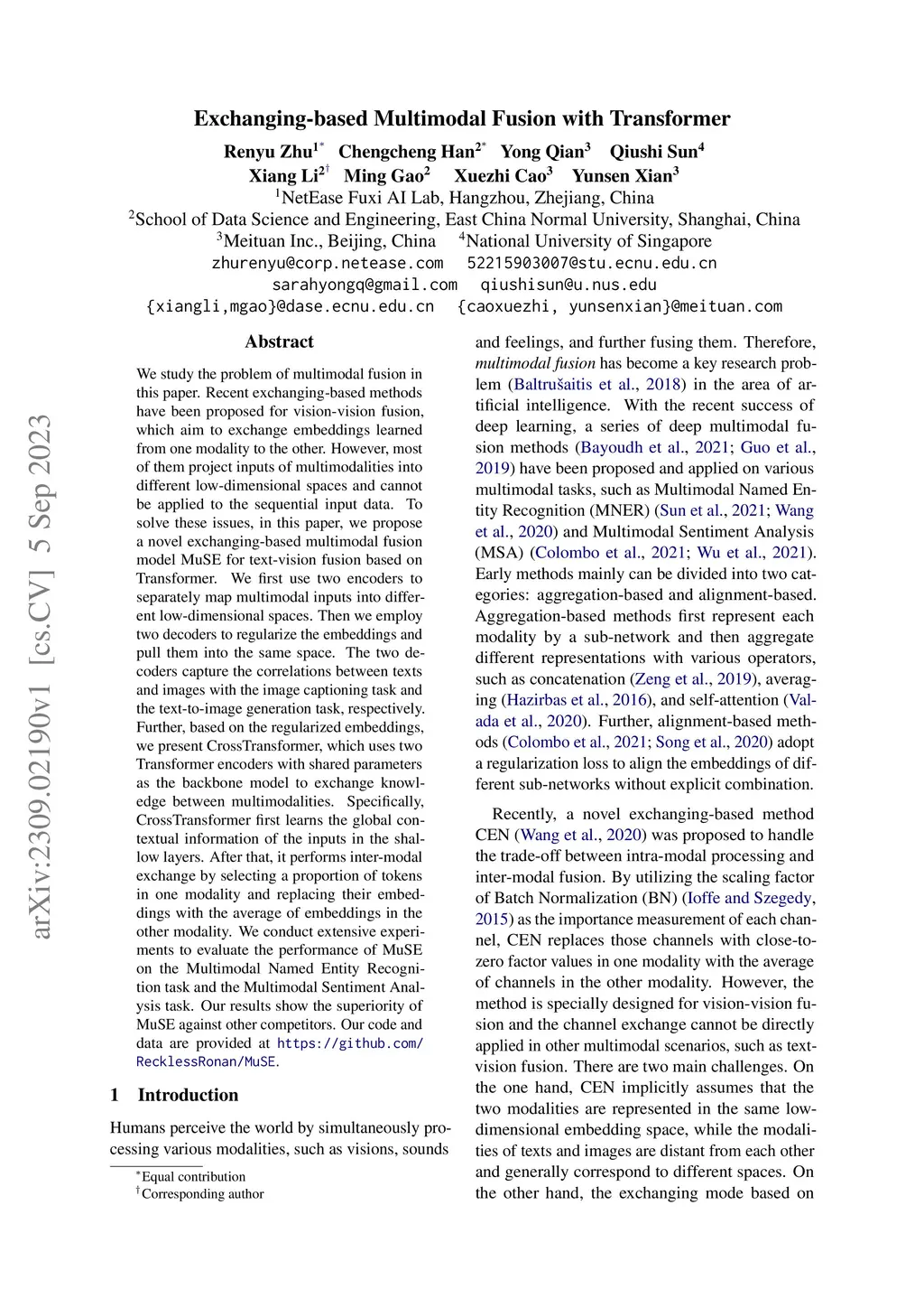 We study the problem of multimodal fusion in this paper. Recent exchanging-based methods have been proposed for vision-vision fusion, which aim to exchange embeddings learned from one modality to the other. However, most of them project inputs of multimodalities into different low-dimensional spaces and cannot be applied to the sequential input data. To solve these issues, in this paper, we propose a novel exchanging-based multimodal fusion model MuSE for text-vision fusion based on Transformer. We first use two encoders to separately map multimodal inputs into different low-dimensional spaces. Then we employ two decoders to regularize the embeddings and pull them into the same space. The two decoders capture the correlations between texts and images with the image captioning task and the text-to-image generation task, respectively. Further, based on the regularized embeddings, we present CrossTransformer, which uses two Transformer encoders with shared parameters as the backbone model to exchange knowledge between multimodalities. Specifically, CrossTransformer first learns the global contextual information of the inputs in the shallow layers. After that, it performs inter-modal exchange by selecting a proportion of tokens in one modality and replacing their embeddings with the average of embeddings in the other modality. We conduct extensive experiments to evaluate the performance of MuSE on the Multimodal Named Entity Recognition task and the Multimodal Sentiment Analysis task. Our results show the superiority of MuSE against other competitors. Our code and data are provided at https://github.com/RecklessRonan/MuSE.