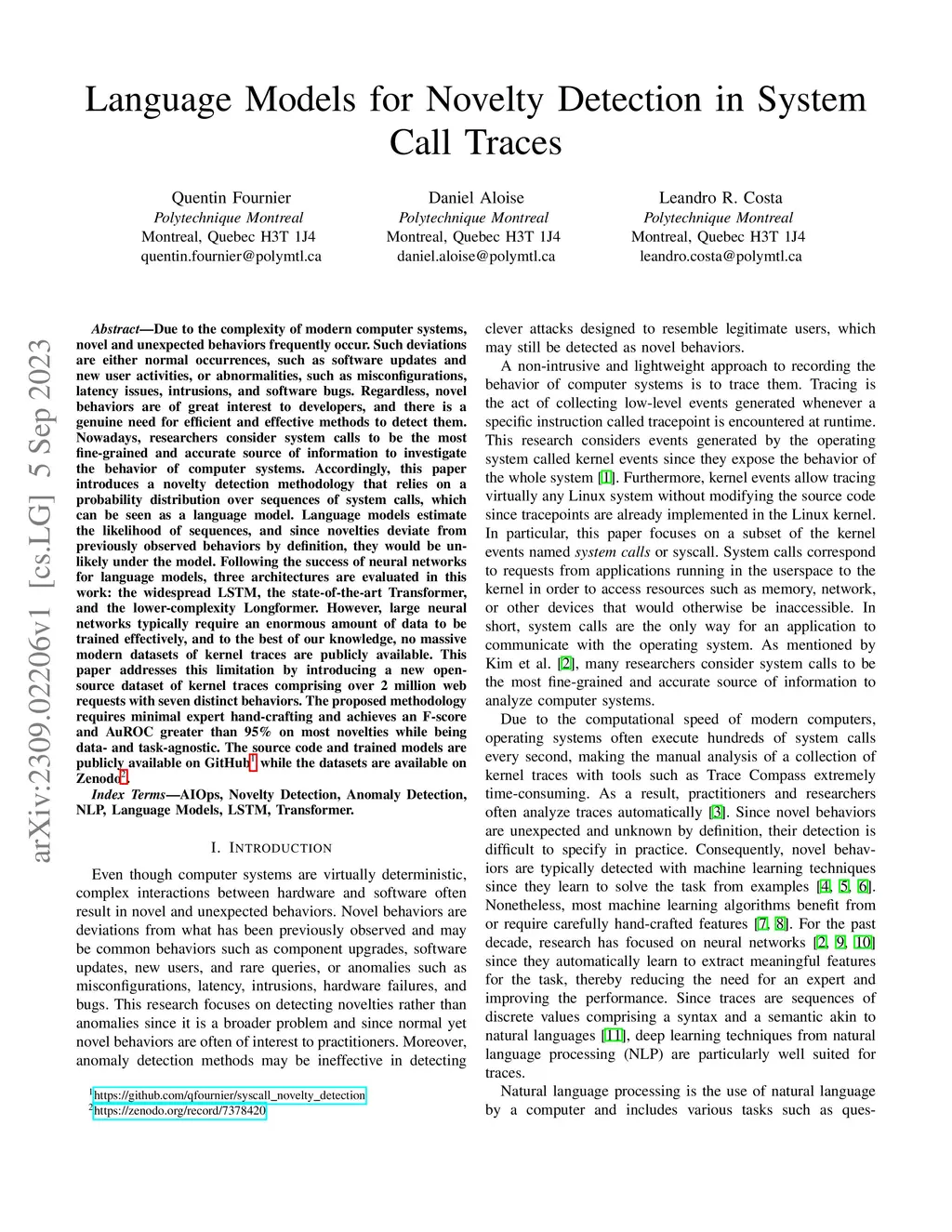 Due to the complexity of modern computer systems, novel and unexpected behaviors frequently occur. Such deviations are either normal occurrences, such as software updates and new user activities, or abnormalities, such as misconfigurations, latency issues, intrusions, and software bugs. Regardless, novel behaviors are of great interest to developers, and there is a genuine need for efficient and effective methods to detect them. Nowadays, researchers consider system calls to be the most fine-grained and accurate source of information to investigate the behavior of computer systems. Accordingly, this paper introduces a novelty detection methodology that relies on a probability distribution over sequences of system calls, which can be seen as a language model. Language models estimate the likelihood of sequences, and since novelties deviate from previously observed behaviors by definition, they would be unlikely under the model. Following the success of neural networks for language models, three architectures are evaluated in this work: the widespread LSTM, the state-of-the-art Transformer, and the lower-complexity Longformer. However, large neural networks typically require an enormous amount of data to be trained effectively, and to the best of our knowledge, no massive modern datasets of kernel traces are publicly available. This paper addresses this limitation by introducing a new open-source dataset of kernel traces comprising over 2 million web requests with seven distinct behaviors. The proposed methodology requires minimal expert hand-crafting and achieves an F-score and AuROC greater than 95% on most novelties while being data- and task-agnostic. The source code and trained models are publicly available on GitHub while the datasets are available on Zenodo.