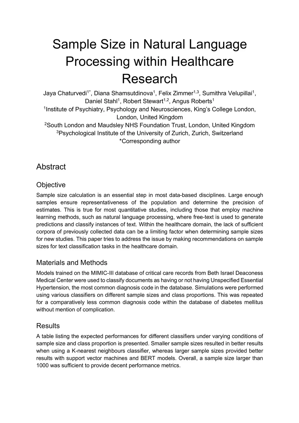 Sample Size in Natural Language Processing within Healthcare Research