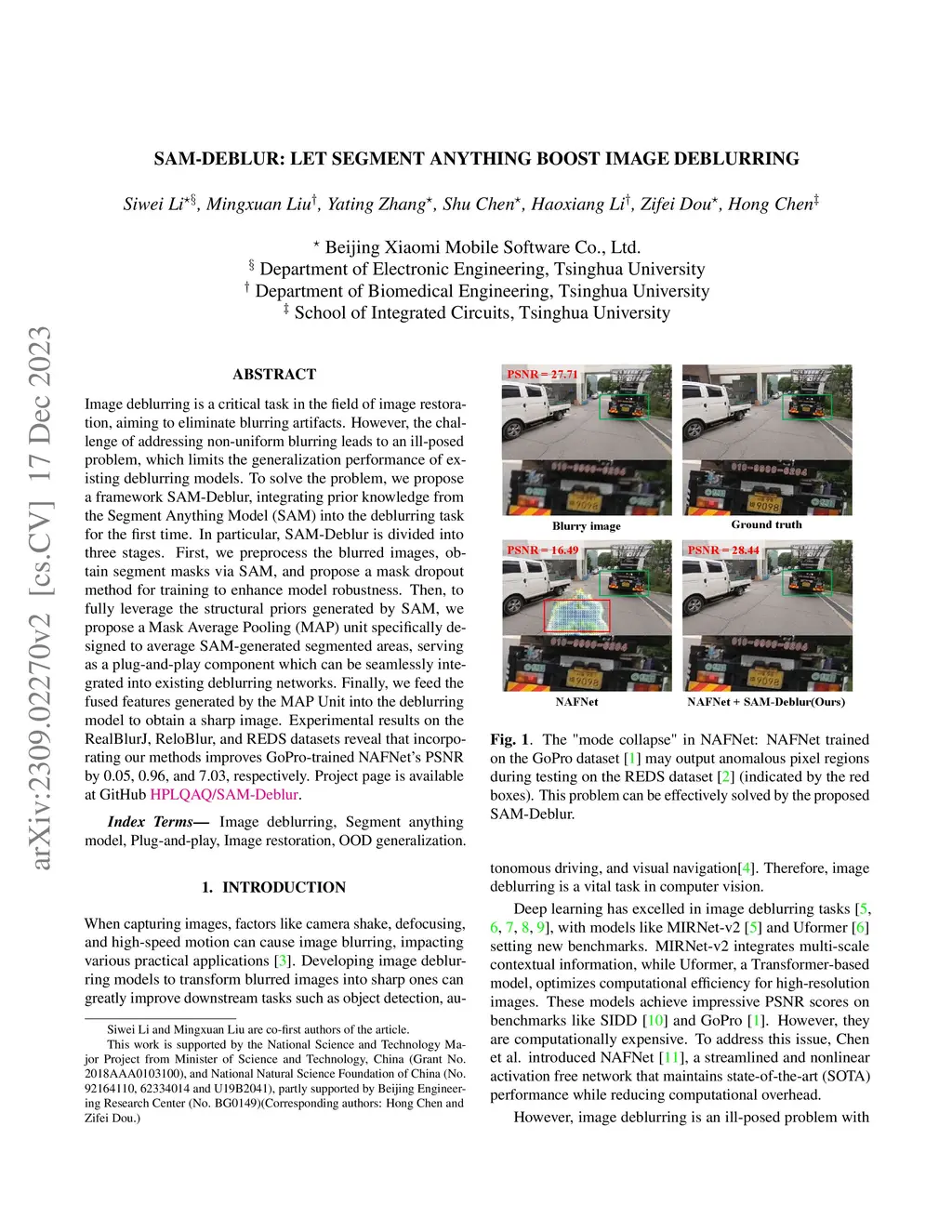 Image deblurring is a critical task in the field of image restoration, aiming to eliminate blurring artifacts. However, the challenge of addressing non-uniform blurring leads to an ill-posed problem, which limits the generalization performance of existing deblurring models. To solve the problem, we propose a framework SAM-Deblur, integrating prior knowledge from the Segment Anything Model (SAM) into the deblurring task for the first time. In particular, SAM-Deblur is divided into three stages. First, we preprocess the blurred images, obtain segment masks via SAM, and propose a mask dropout method for training to enhance model robustness. Then, to fully leverage the structural priors generated by SAM, we propose a Mask Average Pooling (MAP) unit specifically designed to average SAM-generated segmented areas, serving as a plug-and-play component which can be seamlessly integrated into existing deblurring networks. Finally, we feed the fused features generated by the MAP Unit into the deblurring model to obtain a sharp image. Experimental results on the RealBlurJ, ReloBlur, and REDS datasets reveal that incorporating our methods improves GoPro-trained NAFNet's PSNR by 0.05, 0.96, and 7.03, respectively. Project page is available at GitHub \href{https://hplqaq.github.io/projects/sam-deblur}{HPLQAQ/SAM-Deblur}.