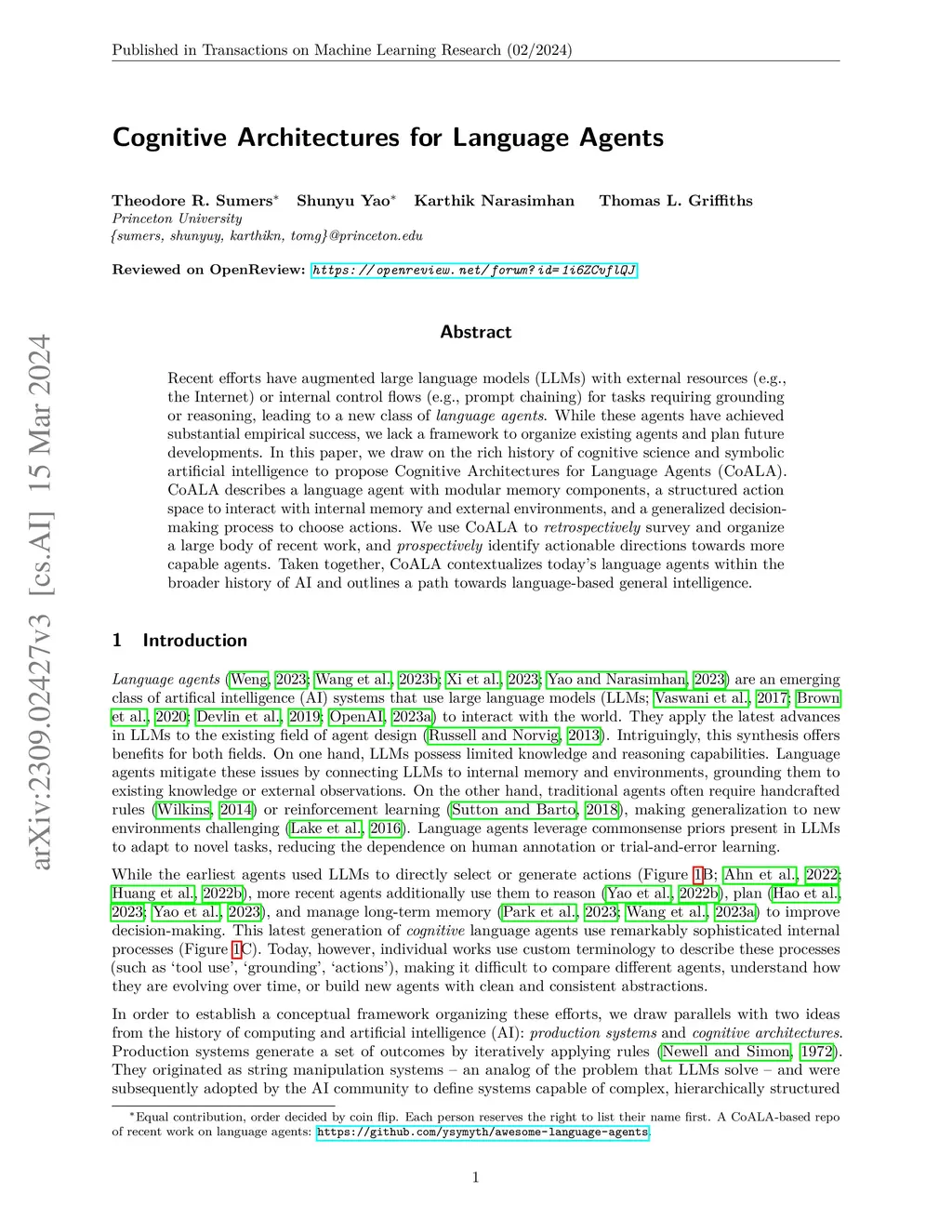 Recent efforts have augmented large language models (LLMs) with external resources (e.g., the Internet) or internal control flows (e.g., prompt chaining) for tasks requiring grounding or reasoning, leading to a new class of language agents. While these agents have achieved substantial empirical success, we lack a systematic framework to organize existing agents and plan future developments. In this paper, we draw on the rich history of cognitive science and symbolic artificial intelligence to propose Cognitive Architectures for Language Agents (CoALA). CoALA describes a language agent with modular memory components, a structured action space to interact with internal memory and external environments, and a generalized decision-making process to choose actions. We use CoALA to retrospectively survey and organize a large body of recent work, and prospectively identify actionable directions towards more capable agents. Taken together, CoALA contextualizes today's language agents within the broader history of AI and outlines a path towards language-based general intelligence.