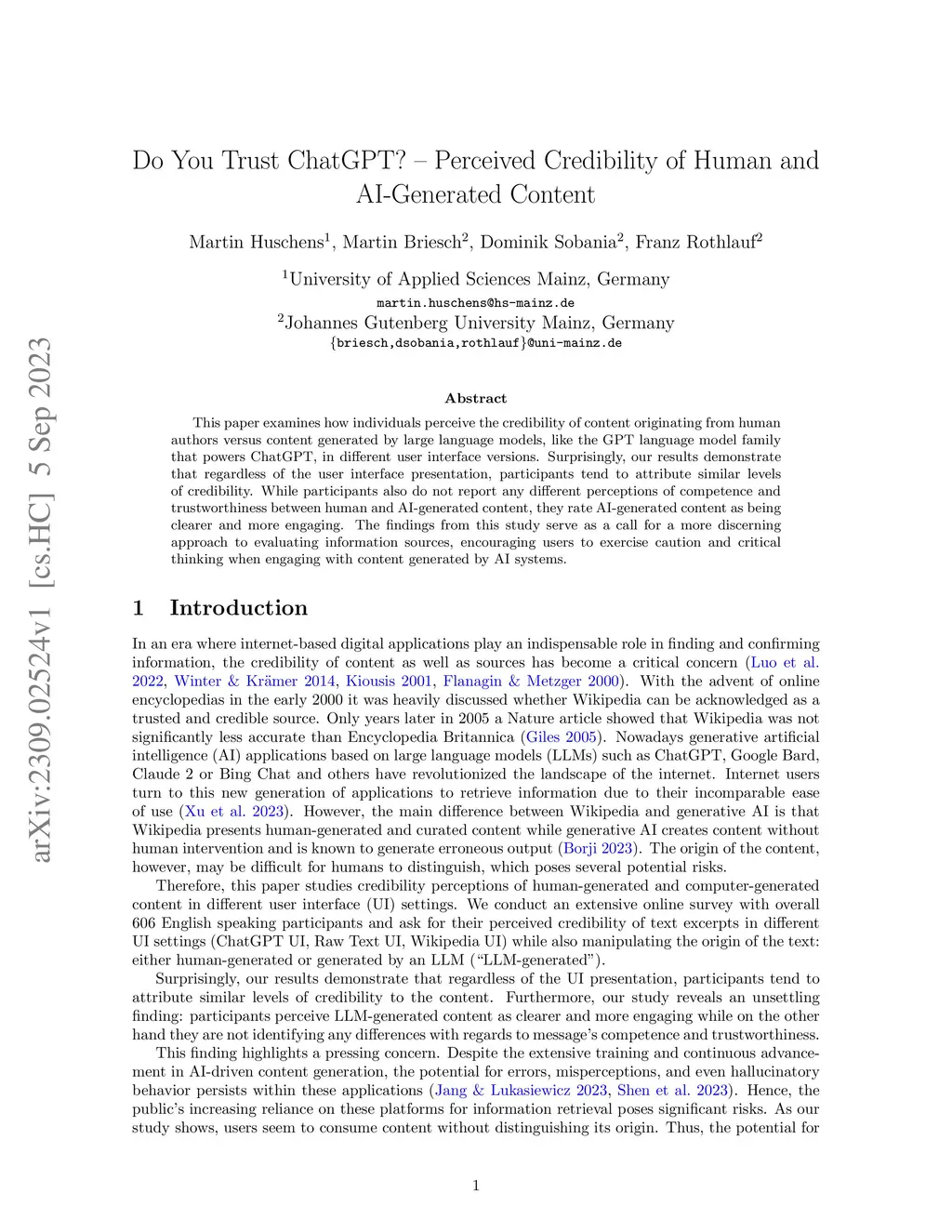 This paper examines how individuals perceive the credibility of content originating from human authors versus content generated by large language models, like the GPT language model family that powers ChatGPT, in different user interface versions. Surprisingly, our results demonstrate that regardless of the user interface presentation, participants tend to attribute similar levels of credibility. While participants also do not report any different perceptions of competence and trustworthiness between human and AI-generated content, they rate AI-generated content as being clearer and more engaging. The findings from this study serve as a call for a more discerning approach to evaluating information sources, encouraging users to exercise caution and critical thinking when engaging with content generated by AI systems.