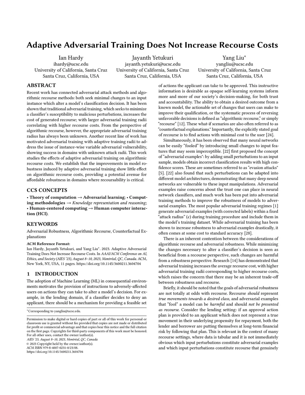 Adaptive Adversarial Training Does Not Increase Recourse Costs