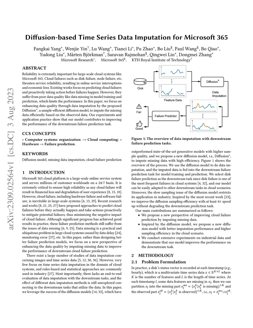 Reliability is extremely important for large-scale cloud systems like Microsoft 365. Cloud failures such as disk failure, node failure, etc. threaten service reliability, resulting in online service interruptions and economic loss. Existing works focus on predicting cloud failures and proactively taking action before failures happen. However, they suffer from poor data quality like data missing in model training and prediction, which limits the performance. In this paper, we focus on enhancing data quality through data imputation by the proposed Diffusion+, a sample-efficient diffusion model, to impute the missing data efficiently based on the observed data. Our experiments and application practice show that our model contributes to improving the performance of the downstream failure prediction task.